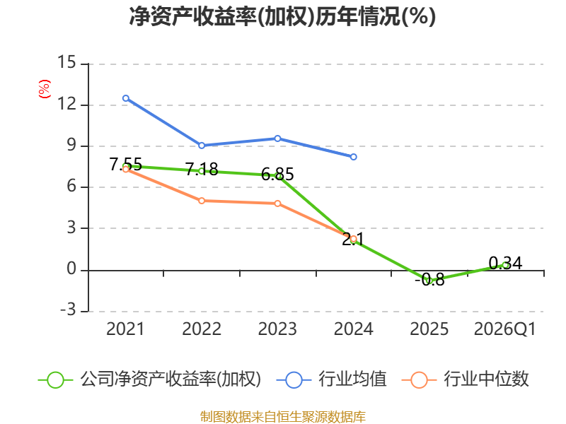 盈利能力方面, 2026年一季度公司加权平均净资产收益率为0.34%,同比下降0.8个百分点。公司2026年第一季度投入资本回报率为0.55%,较上年同期下降0.56个百分点。