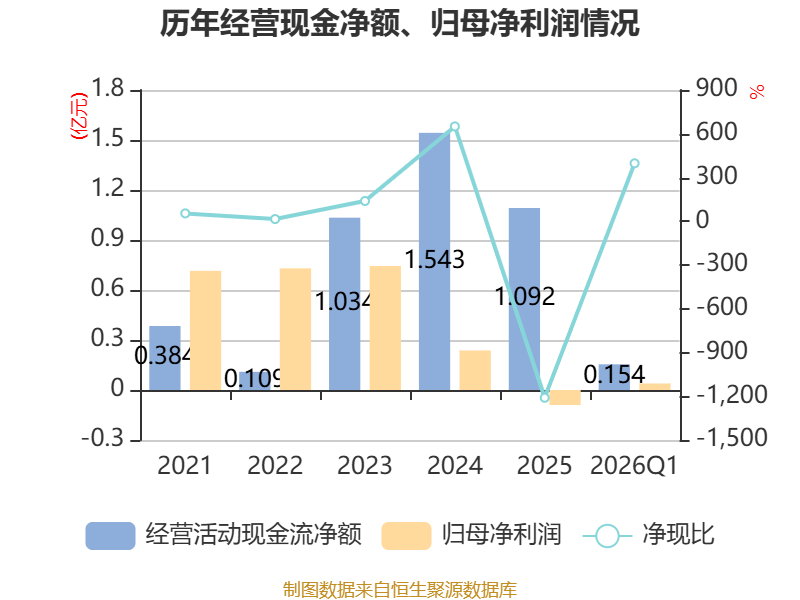 截至2026年一季度末,公司经营活动现金流净额为1544.5万元,同比下降61.45%;筹资活动现金流净额3447.04万元,同比减少70.6万元;投资活动现金流净额-7540.42万元,上年同期为-7979.04万元。