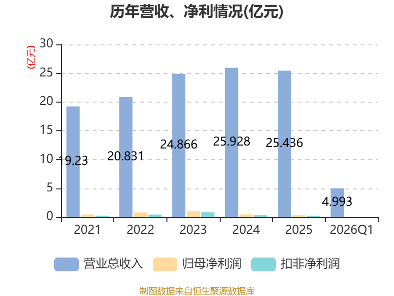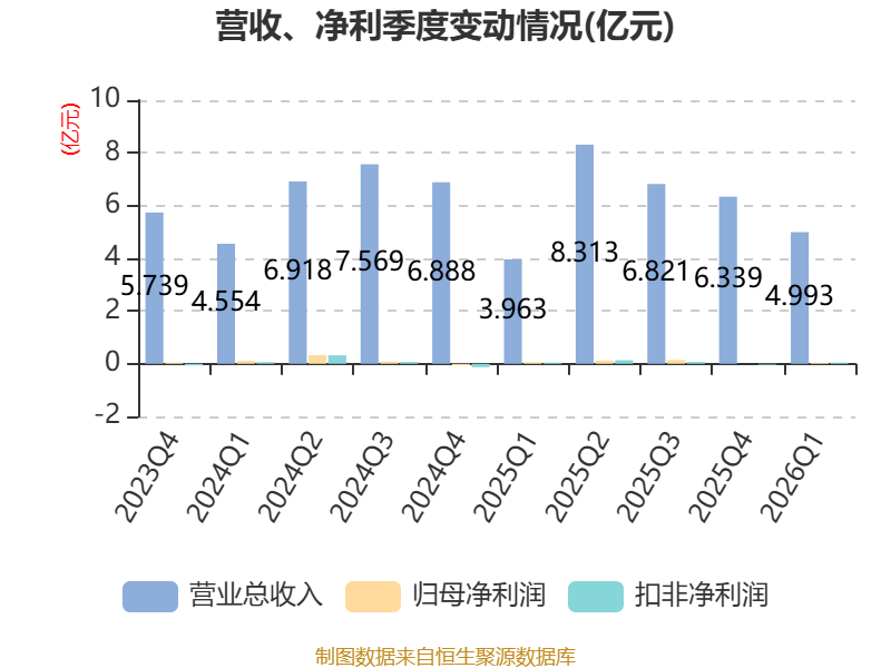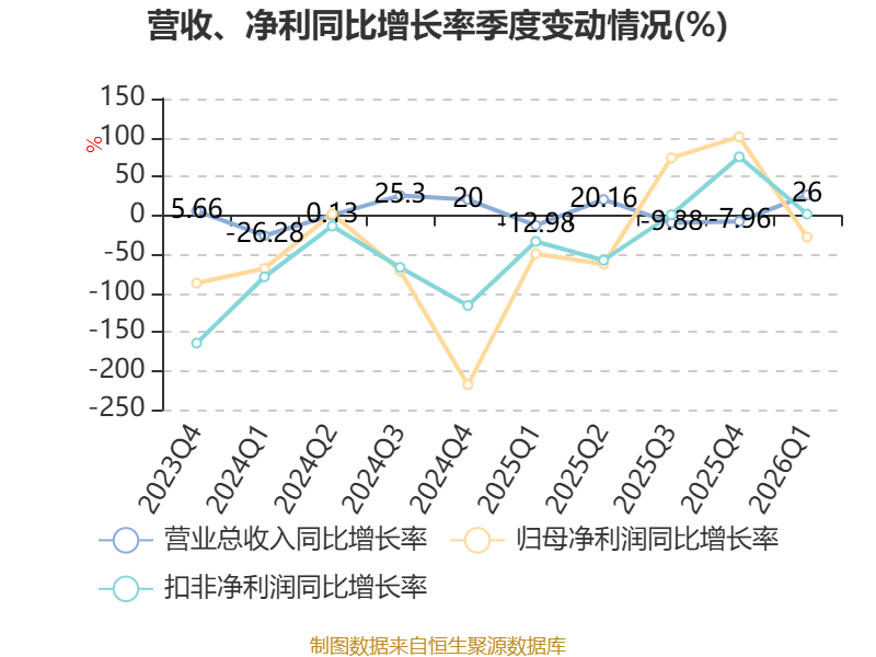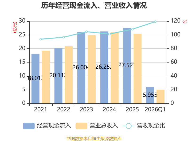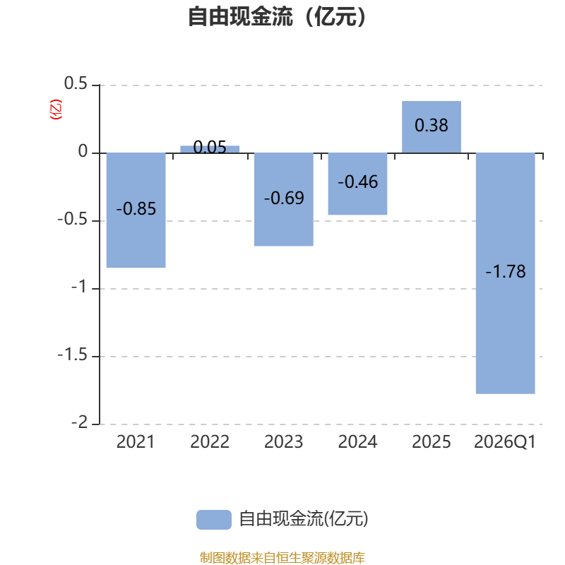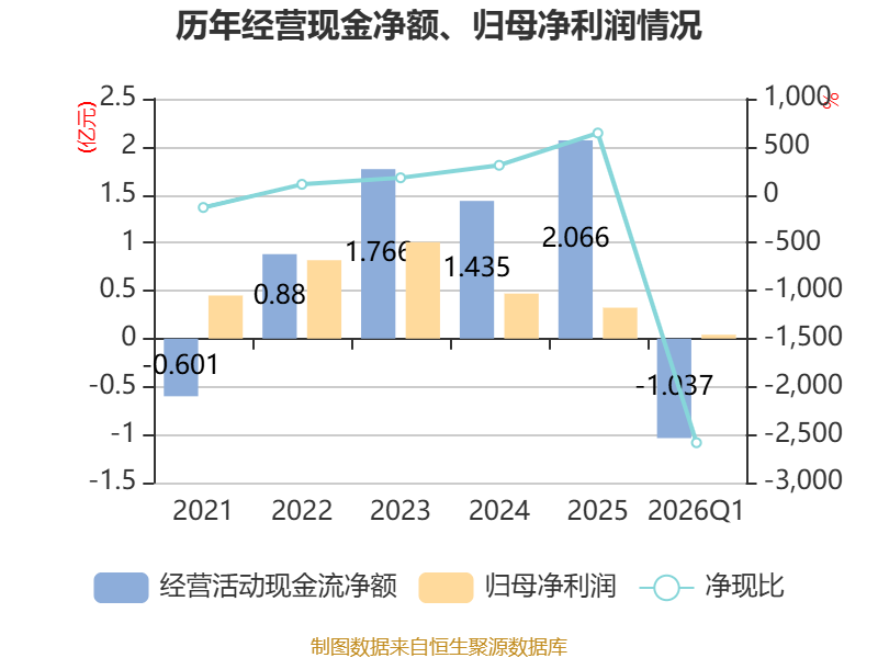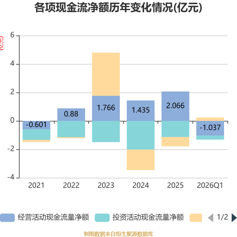 截至2026年一季度末,公司经营活动现金流净额为-1.04亿元,同比减少5623.18万元;筹资活动现金流净额2368.99万元,同比增加1879.64万元;投资活动现金流净额-2813.75万元,上年同期为-4513.85万元。