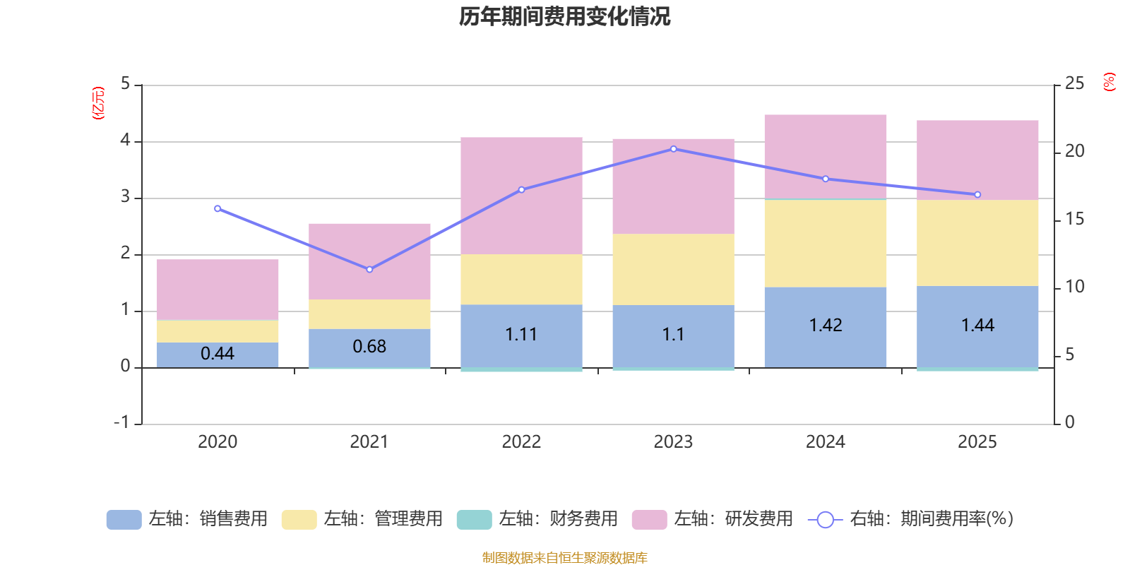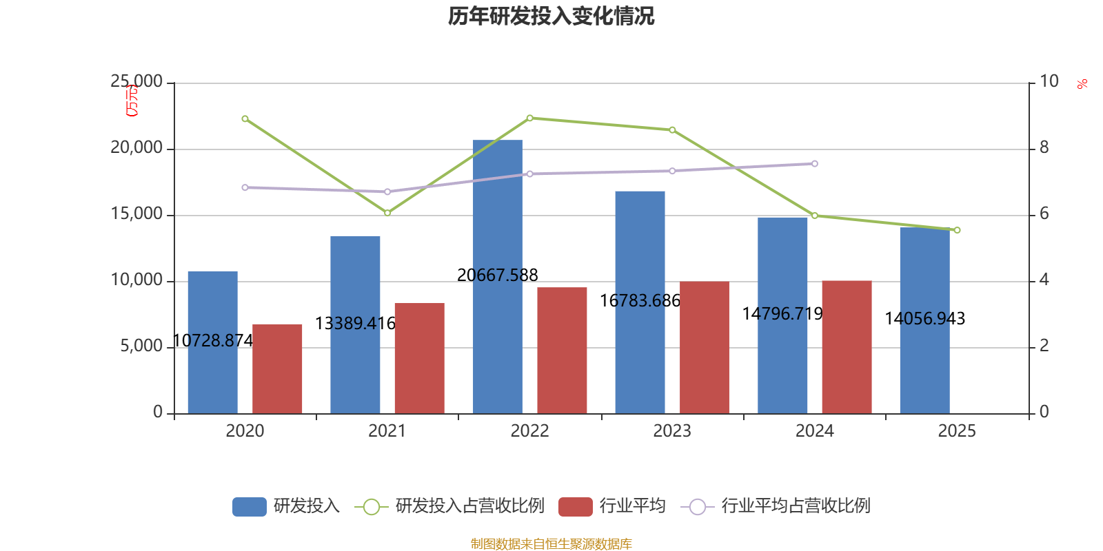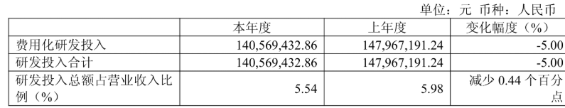2025年全年,公司研发投入金额为1.41亿元,同比下降5%;研发投入占营业收入比例为5.54%,相比上年同期下降0.44个百分点。