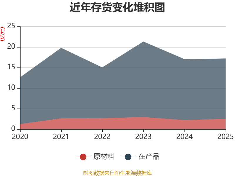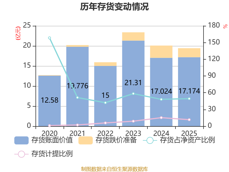 从存货变动来看,截至2025年末,公司存货账面价值为17.17亿元,占净资产的49.31%,较上年末增加1505.38万元。其中,存货跌价准备为2.25亿元,计提比例为11.57%。