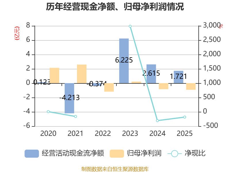 截至2025年,公司经营活动现金流净额为1.72亿元,同比下降34.17%;筹资活动现金流净额-636.5万元,同比增加7329.28万元;投资活动现金流净额1.33亿元,上年同期为-1.44亿元。