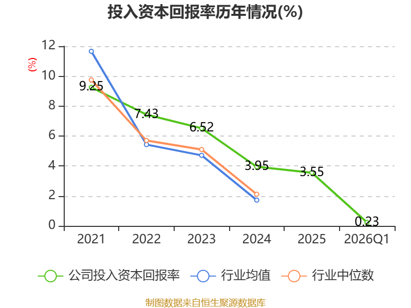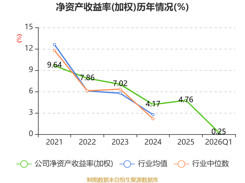 盈利能力方面, 2026年一季度公司加权平均净资产收益率为0.25%,同比下降0.76个百分点。公司2026年第一季度投入资本回报率为0.23%,较上年同期下降0.58个百分点。
