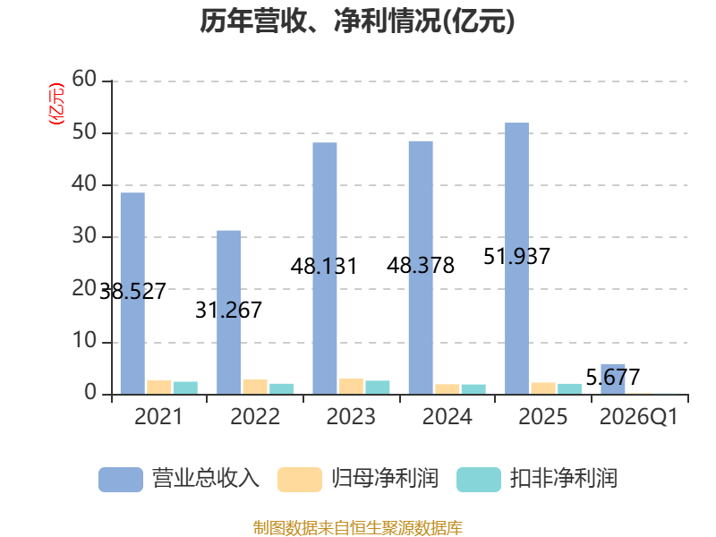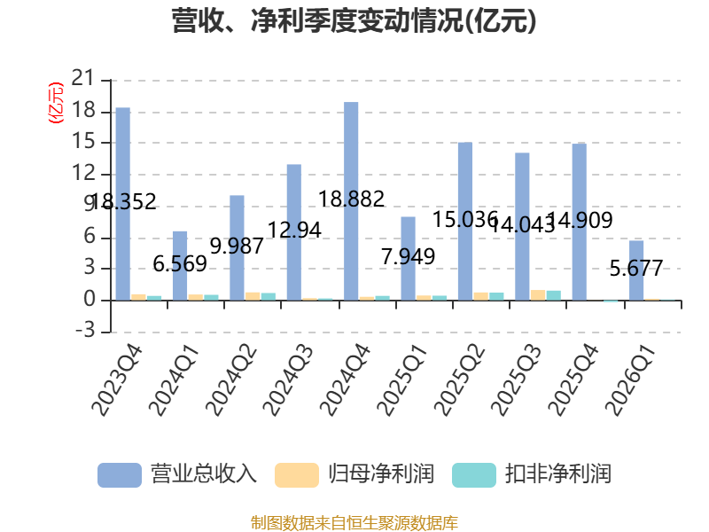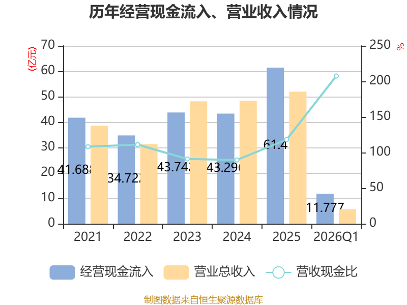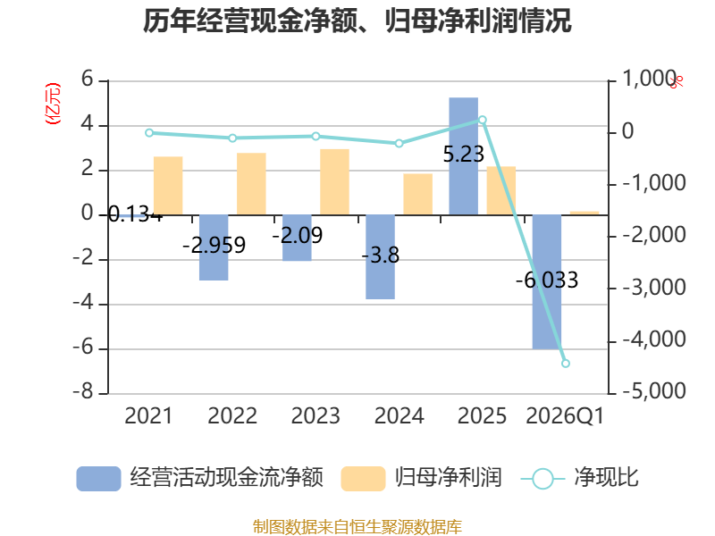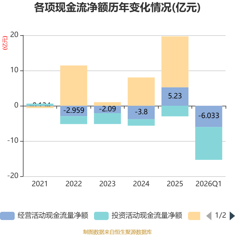 截至2026年一季度末,公司经营活动现金流净额为-6.03亿元,同比减少4.89亿元;筹资活动现金流净额124.97万元,同比增加6008.33万元;投资活动现金流净额-9.31亿元,上年同期为-5570.6万元。