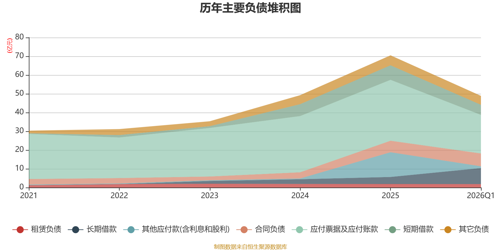 负债重大变化方面,截至2026年一季度末,公司其他应付款(含利息和股利)较上年末减少92.65%,占公司总资产比重下降10.32个百分点;应付票据及应付账款较上年末减少36.68%,占公司总资产比重下降8.51个百分点;长期借款较上年末增加129.49%,占公司总资产比重上升4.74个百分点;短期借款较上年末减少30.81%,占公司总资产比重下降1.61个百分点。