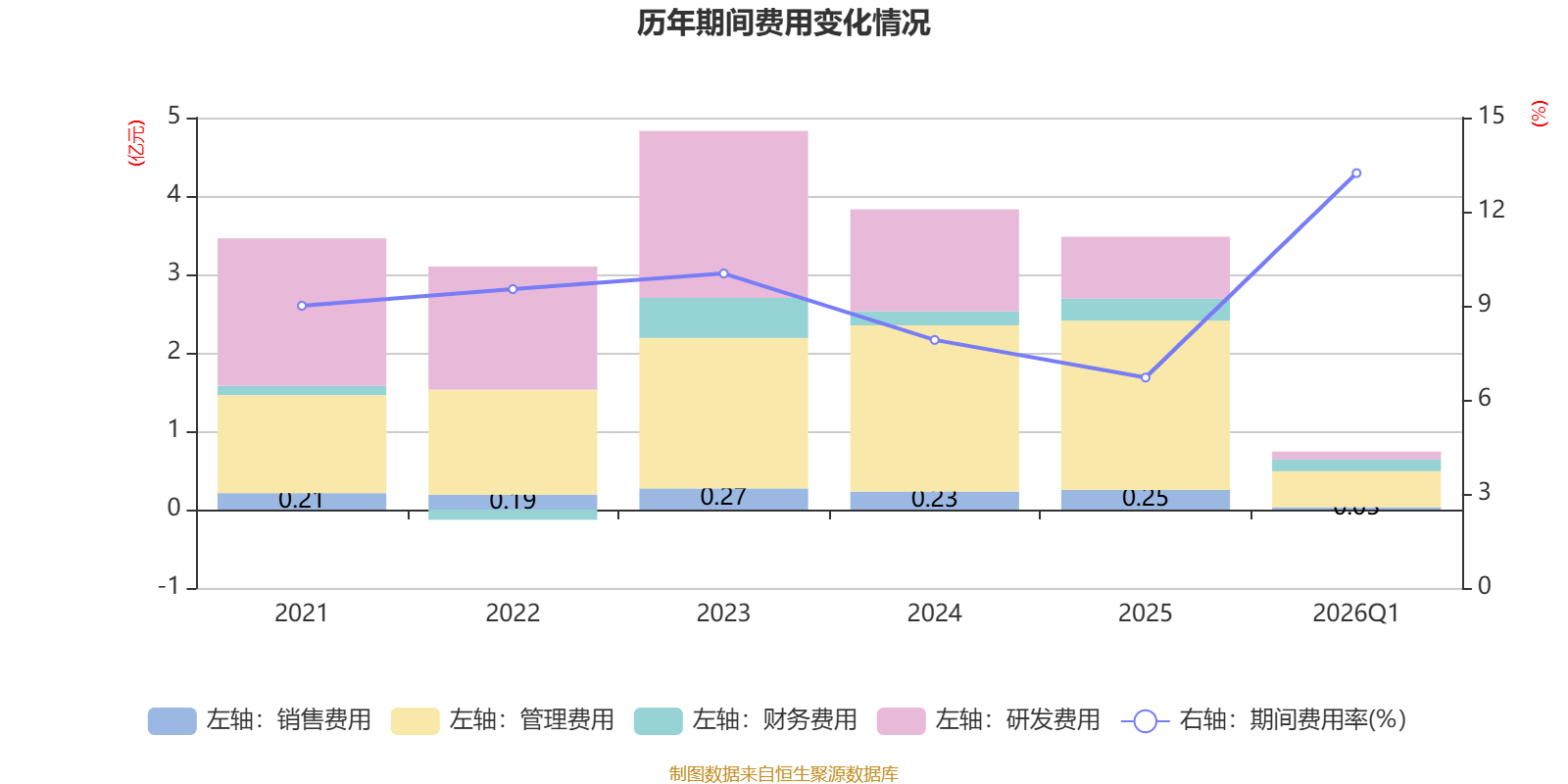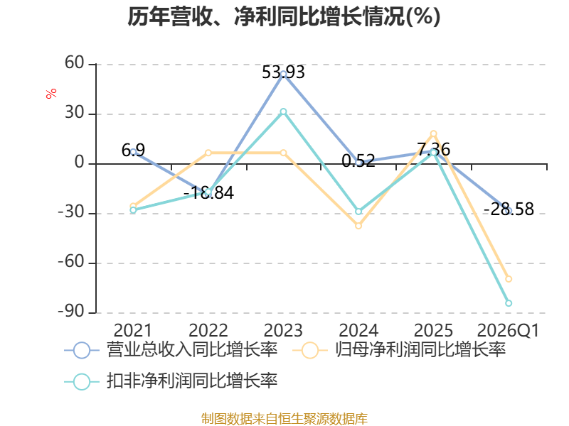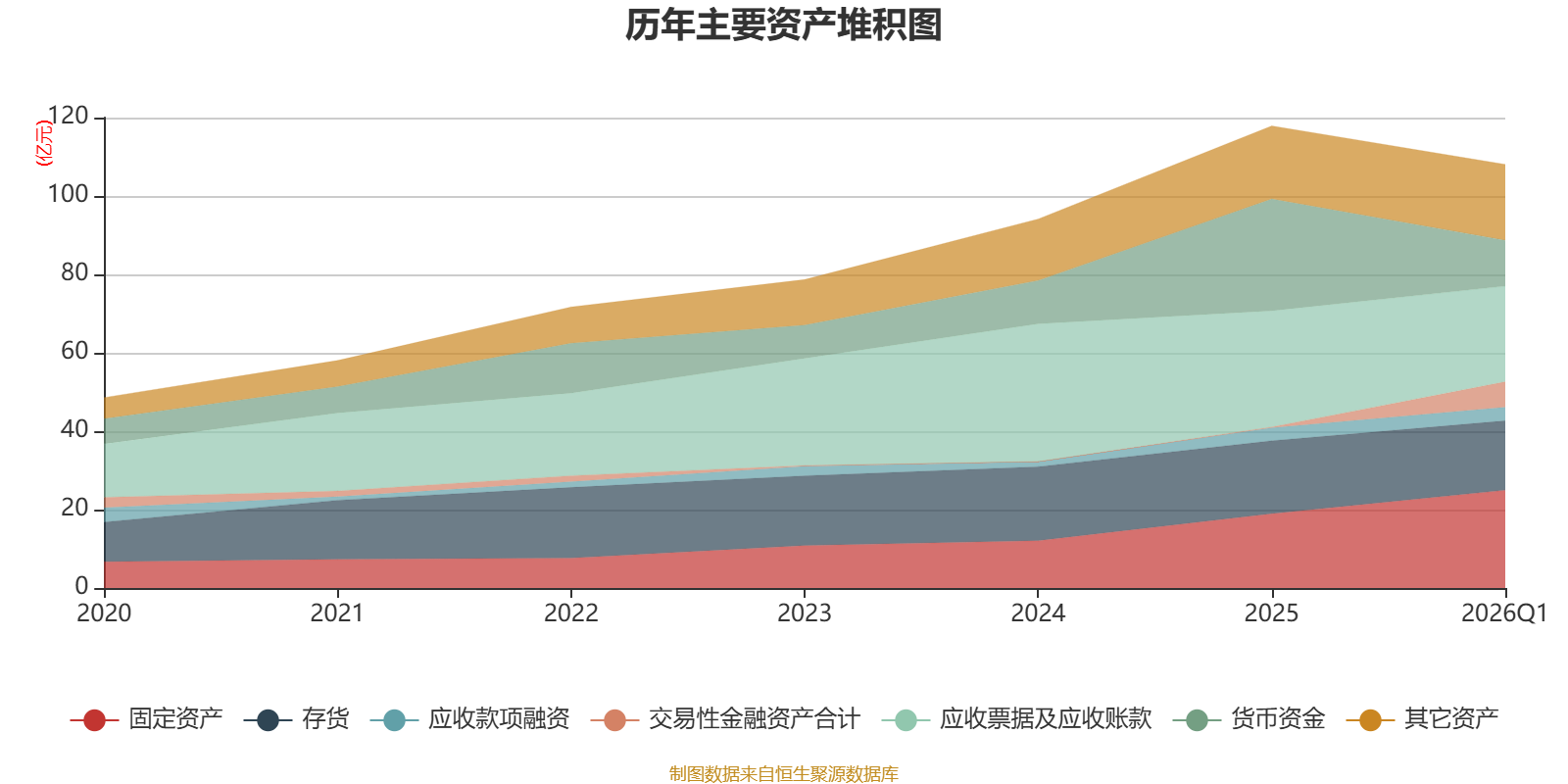资产重大变化方面,截至2026年一季度末,公司货币资金较上年末减少58.95%,占公司总资产比重下降13.39个百分点;固定资产较上年末增加31.67%,占公司总资产比重上升7.02个百分点;交易性金融资产合计较上年末增加3150.28%,占公司总资产比重上升5.85个百分点;应收票据及应收账款较上年末减少17.82%,占公司总资产比重下降2.6个百分点。