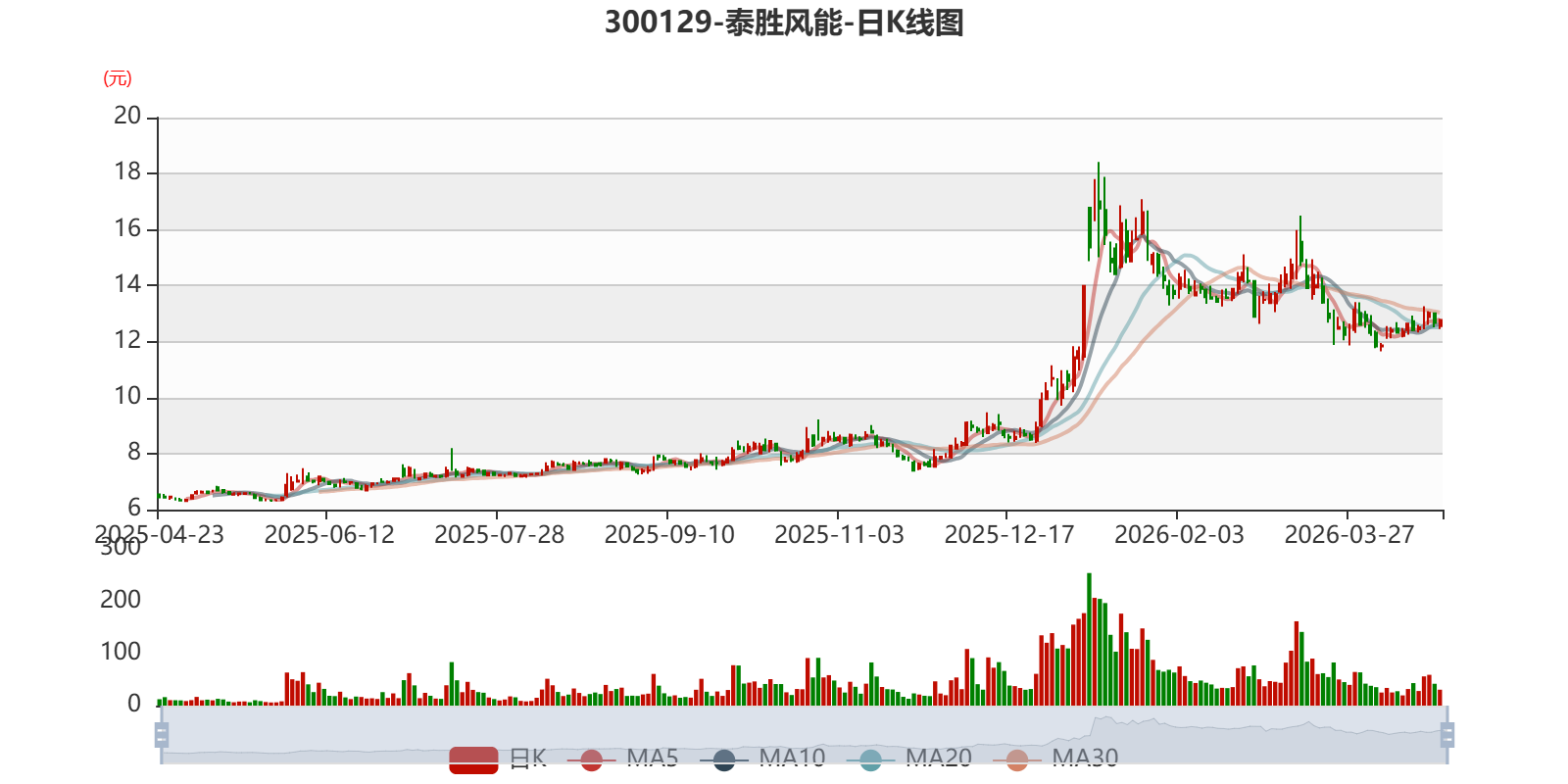 中证智能财讯泰胜风能(300129)4月23日披露2026年第一季度报告。公司实现营业总收入5.68亿元,同比下降28.58%;归母净利润1361.28万元,同比下降69.82%;扣非净利润671.11万元,同比下降84.47%;经营活动产生的现金流量净额为-6.03亿元,上年同期为-1.15亿元;报告期内,泰胜风能基本每股收益为0.013元,加权平均净资产收益率为0.25%。