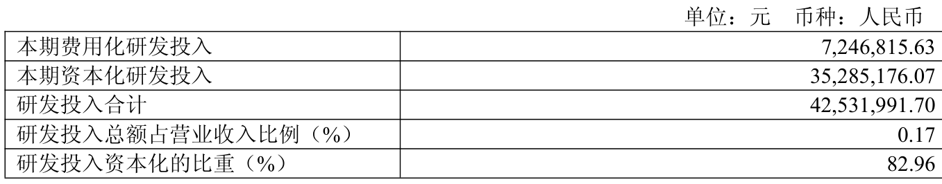 2025年全年,公司研发投入金额为4253.2万元,同比下降19.35%;研发投入占营业收入比例为0.17%,相比上年同期下降0.05个百分点。此外,公司全年研发投入资本化率为82.96%。