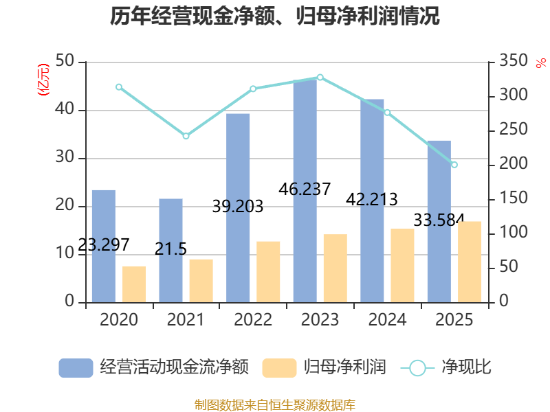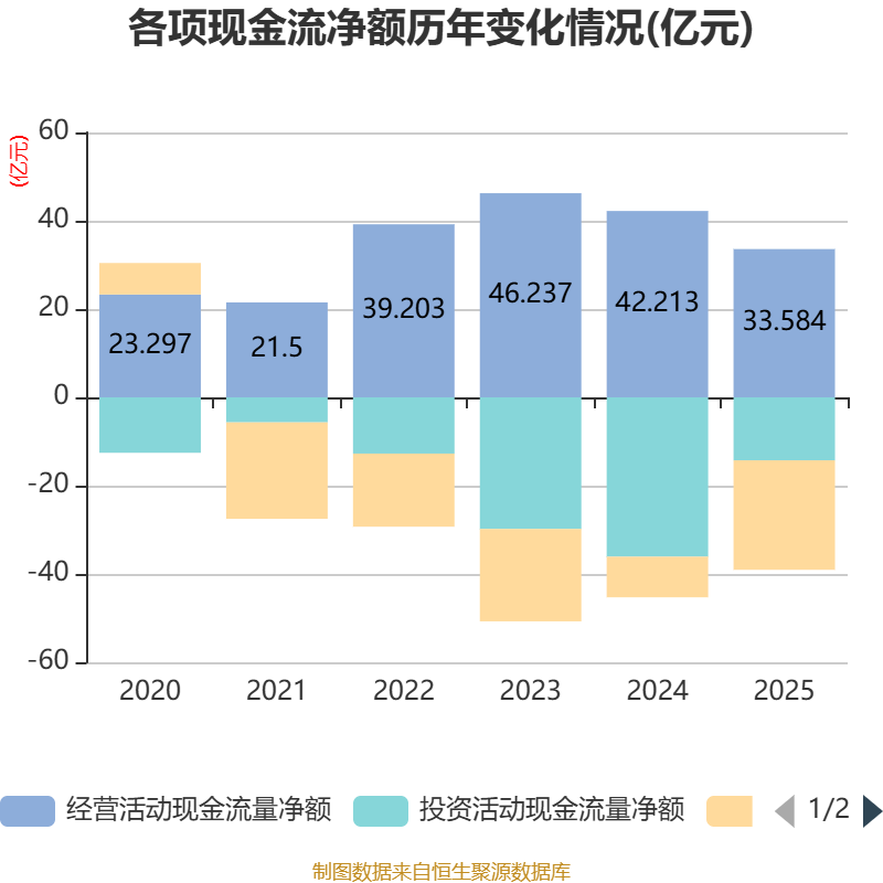 截至2025年,公司经营活动现金流净额为33.58亿元,同比下降20.44%;筹资活动现金流净额-24.8亿元,同比减少15.6亿元;投资活动现金流净额-14.26亿元,上年同期为-36.09亿元。