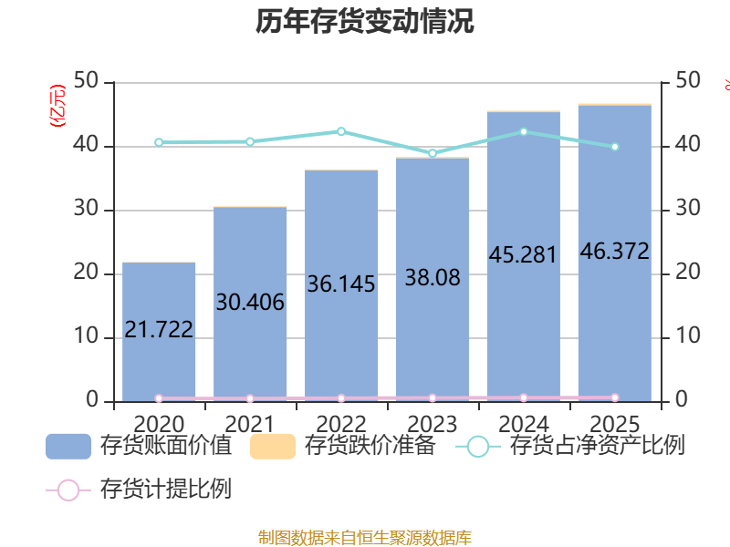 从存货变动来看,截至2025年末,公司存货账面价值为46.37亿元,占净资产的39.86%,较上年末增加1.09亿元。其中,存货跌价准备为2583.81万元,计提比例为0.55%。