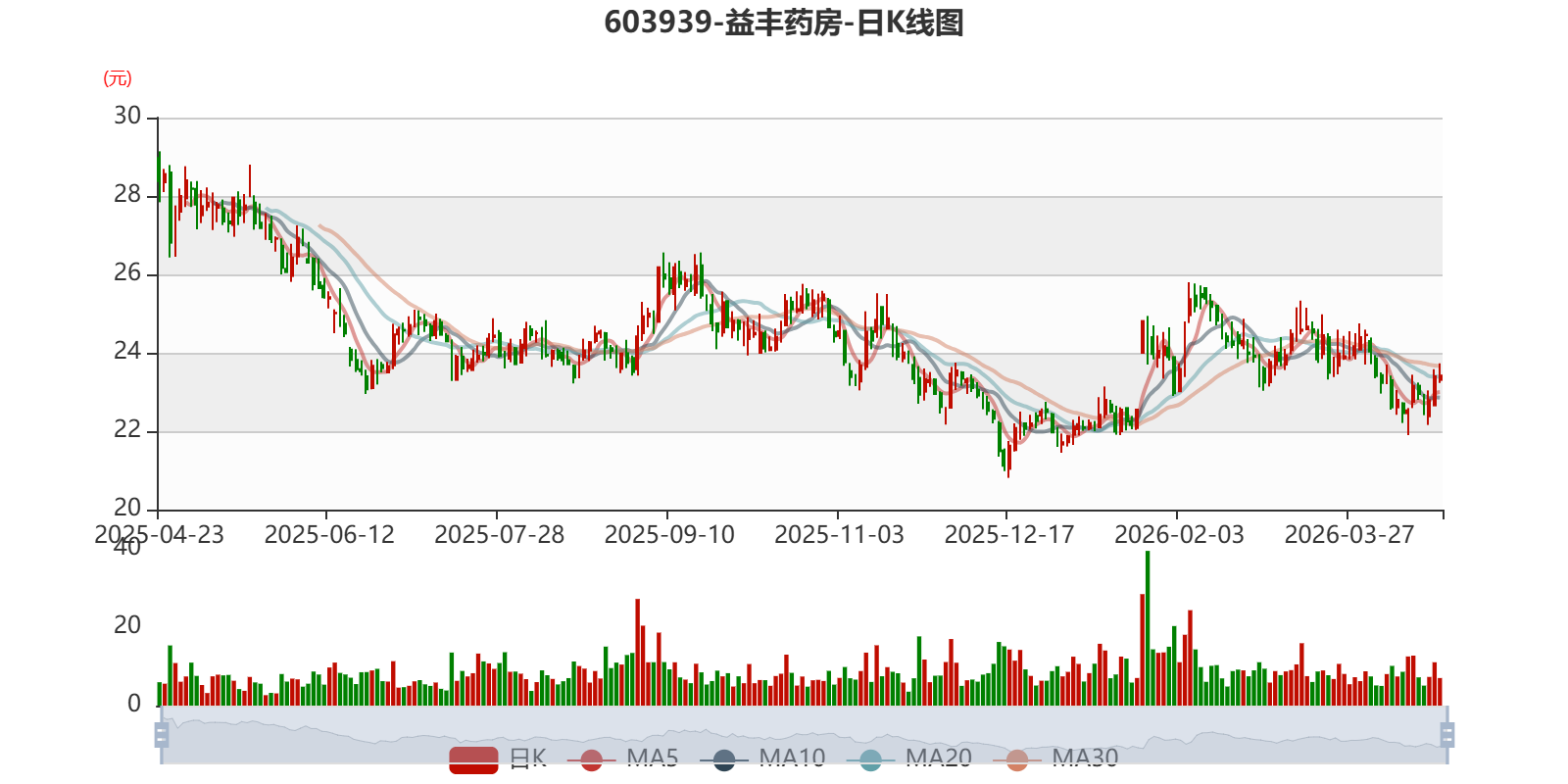 中证智能财讯益丰药房(603939)4月23日披露2025年年度报告。2025年,公司实现营业总收入244.33亿元,同比增长1.54%;归母净利润16.78亿元,同比增长9.81%;扣非净利润16.12亿元,同比增长7.65%;经营活动产生的现金流量净额为33.58亿元,同比下降20.44%;报告期内,益丰药房基本每股收益为1.38元,加权平均净资产收益率为14.98%。公司2025年度分配预案为:拟向全体股东每10股派现4元(含税)。