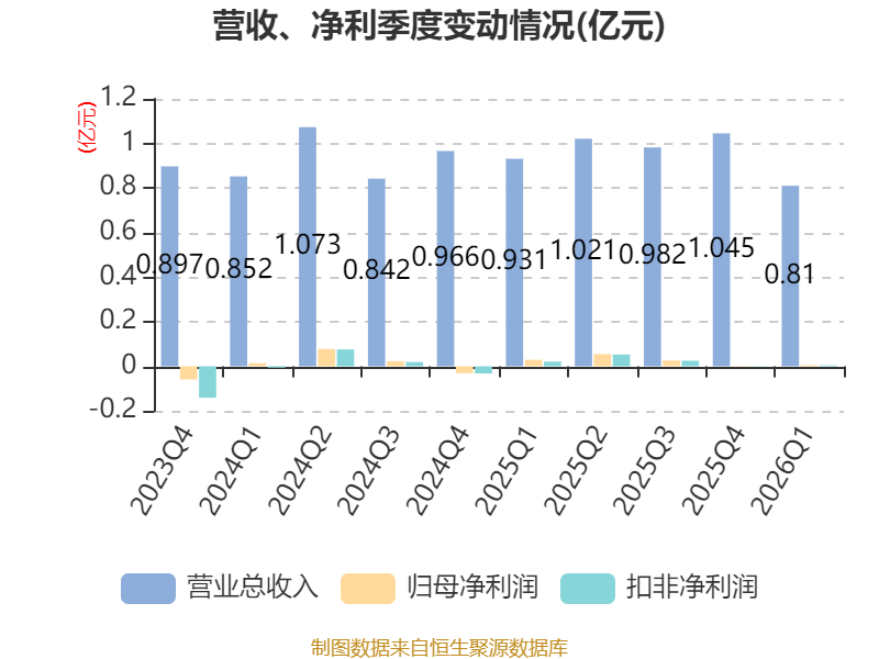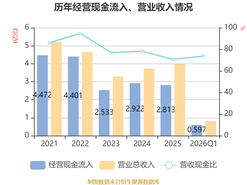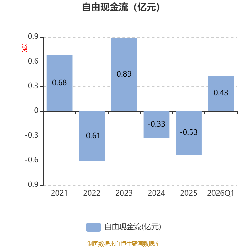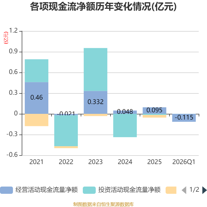 截至2026年一季度末,公司经营活动现金流净额为-1147.31万元,同比增加500.52万元;筹资活动现金流净额0元,与同期相比基本不变;投资活动现金流净额9.85万元,上年同期为-224.11万元。