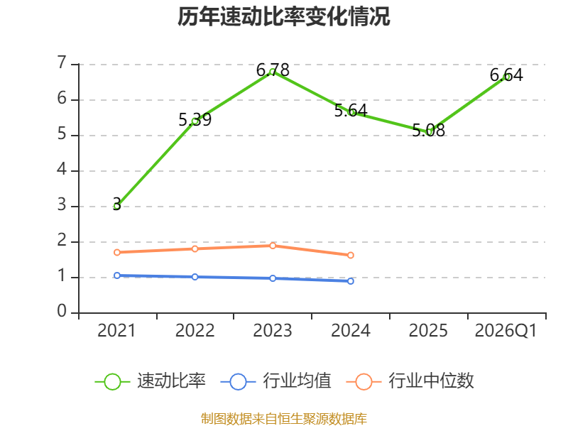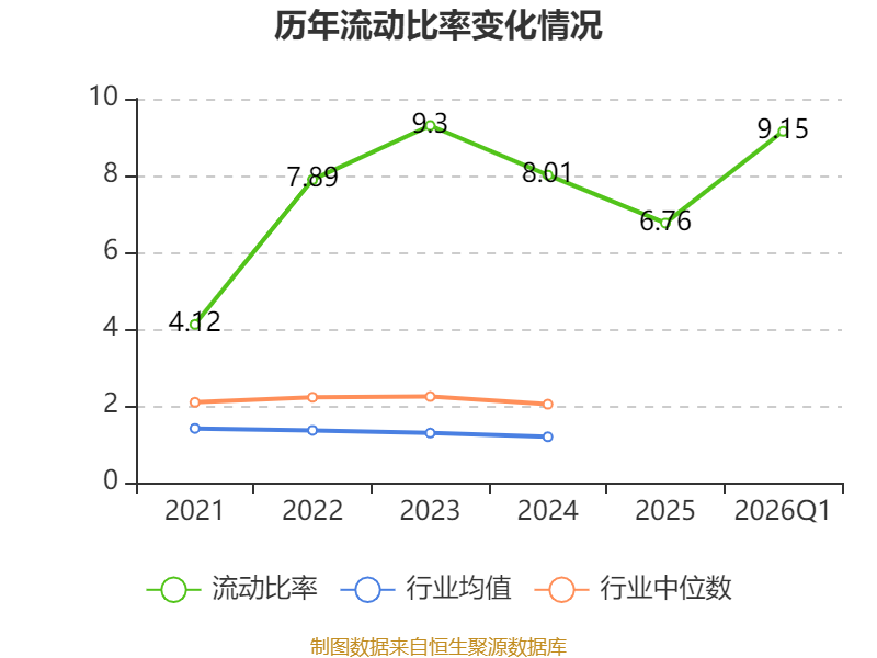 2026年第一季度,公司流动比率为9.15,速动比率为6.64。