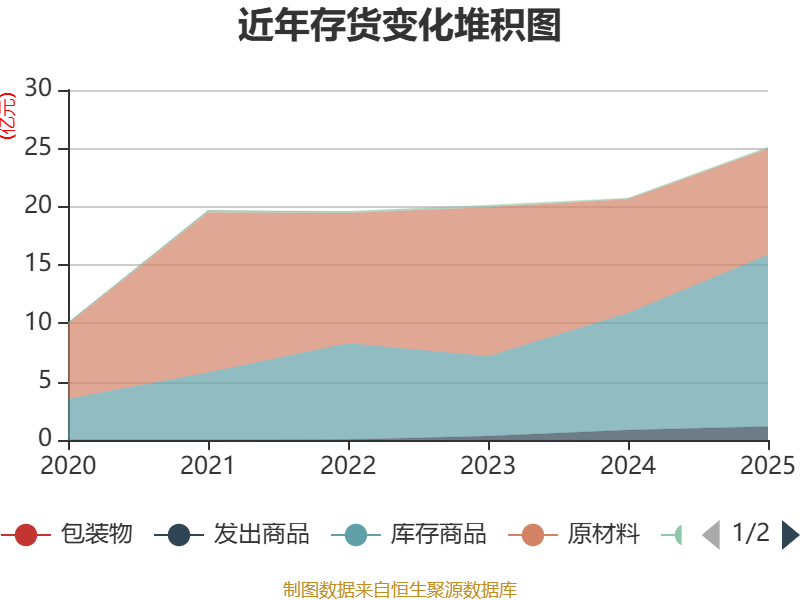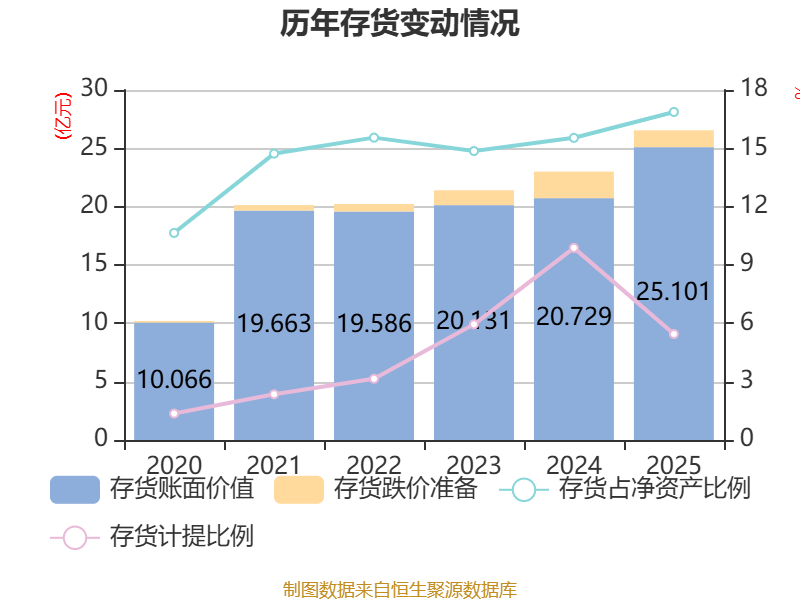 从存货变动来看,截至2025年末,公司存货账面价值为25.1亿元,占净资产的16.87%,较上年末增加4.37亿元。其中,存货跌价准备为1.45亿元,计提比例为5.45%。