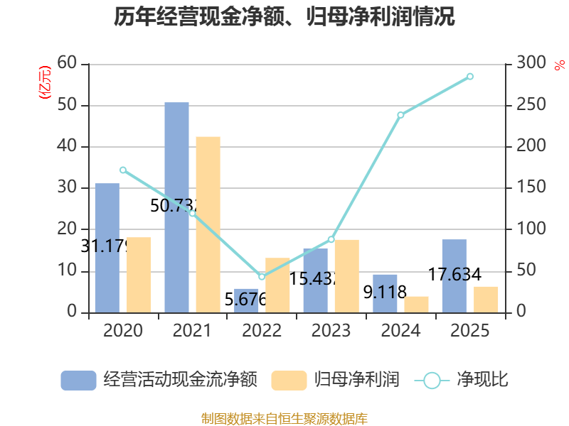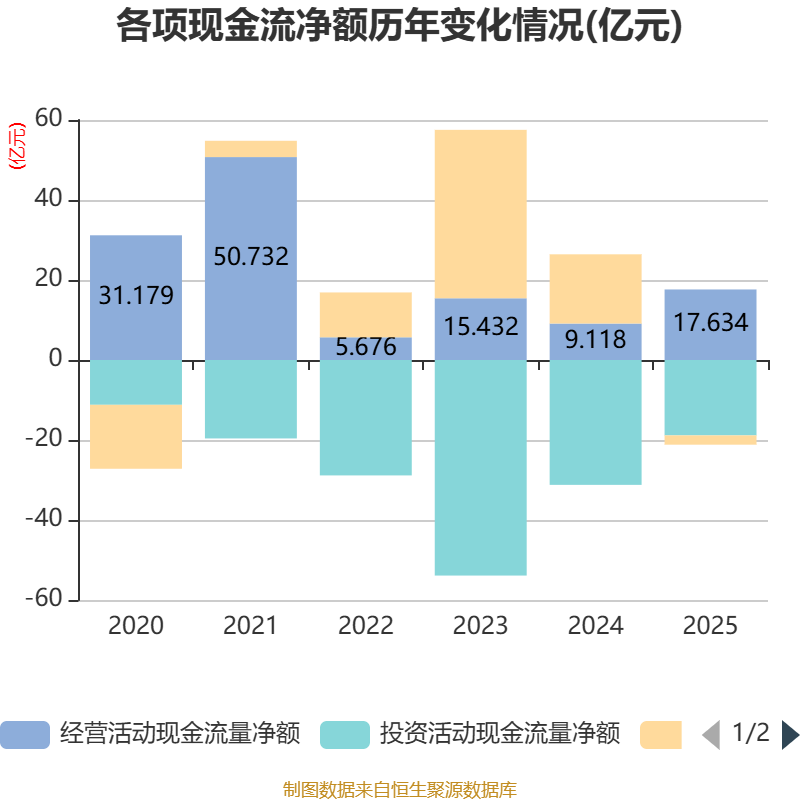 截至2025年,公司经营活动现金流净额为17.63亿元,同比增长93.4%;筹资活动现金流净额-2.32亿元,同比减少19.63亿元;投资活动现金流净额-18.85亿元,上年同期为-31.22亿元。