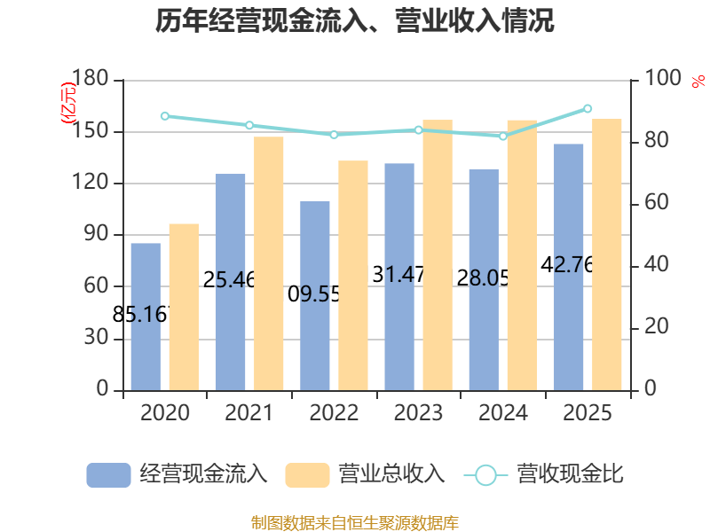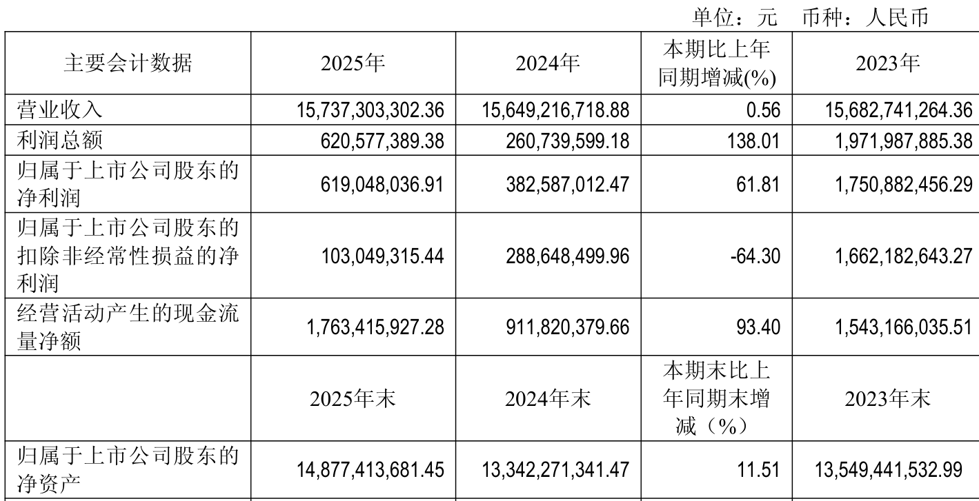 资产重大变化方面,截至2025年末,公司在建工程合计较上年末减少27.05%,占公司总资产比重下降2.57个百分点;存货较上年末增加21.09%,占公司总资产比重上升1.35个百分点;固定资产较上年末增加0.69%,占公司总资产比重上升0.99个百分点;货币资金较上年末减少10.85%,占公司总资产比重下降0.91个百分点。