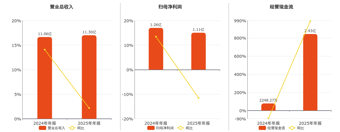 公司营业总收入为11.30亿元,在已披露的同业公司中排名第16,较去年同报告期营业总收入增加2385.74万元,实现3年连续上涨,同比较去年同期上涨2.16%。归母净利润为1.11亿元,在已披露的同业公司中排名第10,较去年同报告期归母净利润减少1450.50万元,同比较去年同期下降11.55%。经营活动现金净流入为2.43亿元,在已披露的同业公司中排名第7,较去年同报告期经营活动现金净流入增加2.21亿元,同比较去年同期上涨982.63%。