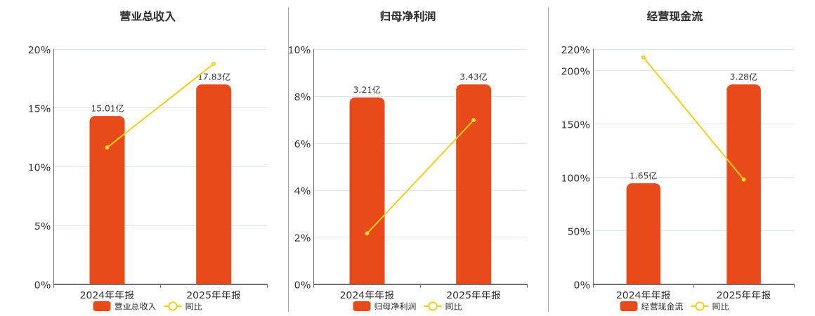 公司营业总收入为17.83亿元。归母净利润为3.43亿元。经营活动现金净流入为3.28亿元。