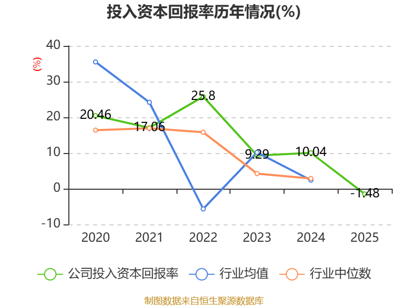 数据显示,2025年公司加权平均净资产收益率为-1.15%,较上年同期下降12.03个百分点。公司2025年投入资本回报率为-1.48%,较上年同期下降11.52个百分点。