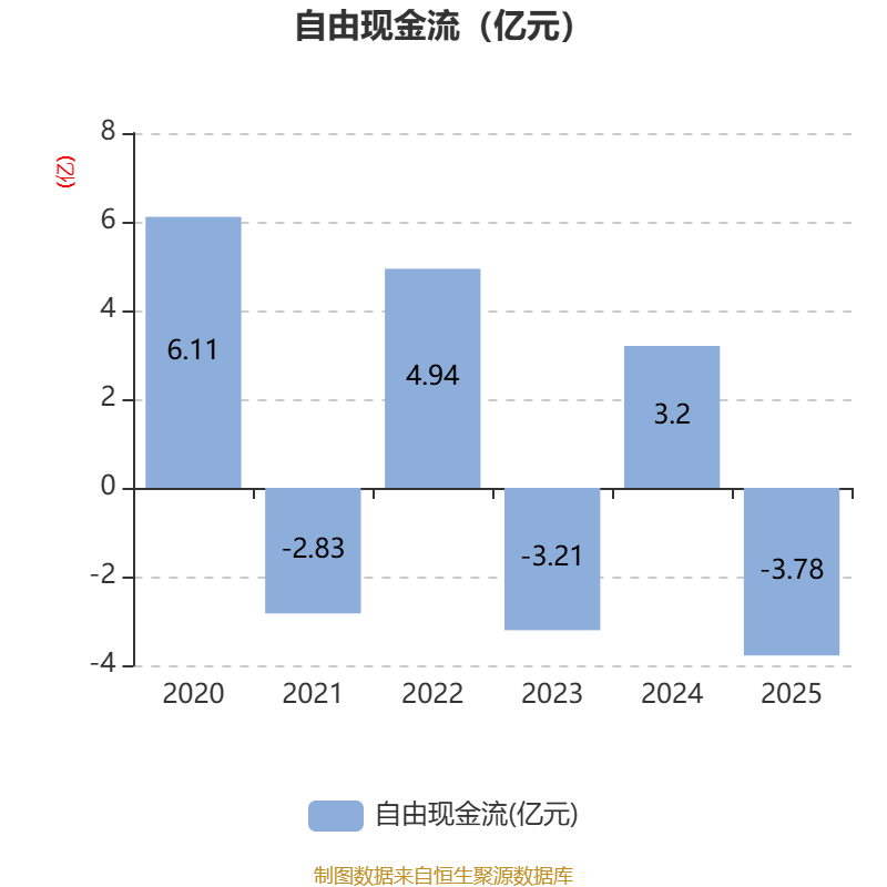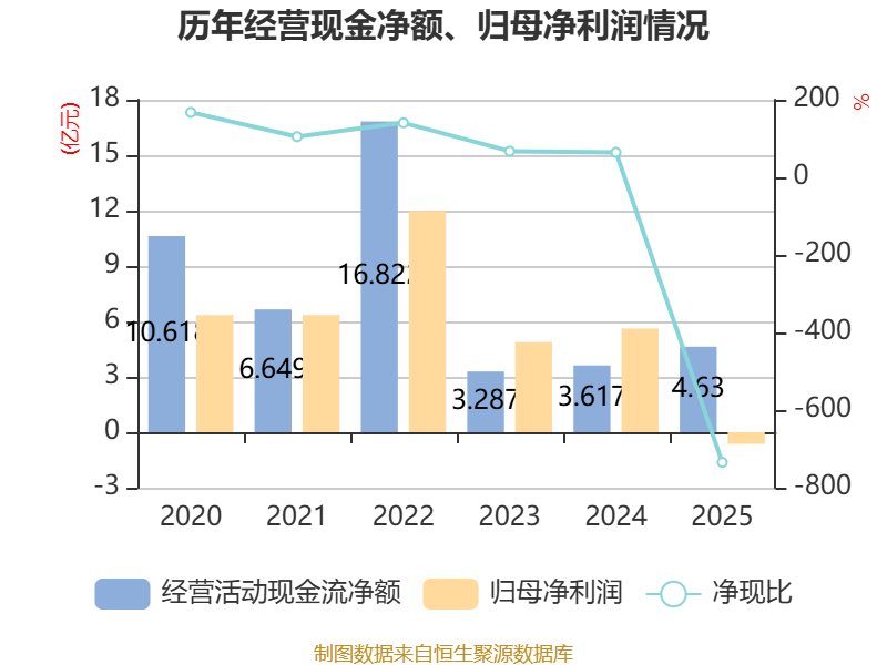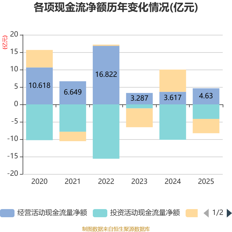 截至2025年,公司经营活动现金流净额为4.63亿元,同比增长28.01%;筹资活动现金流净额-4.1亿元,同比减少10.49亿元;投资活动现金流净额-4.17亿元,上年同期为-10.17亿元。