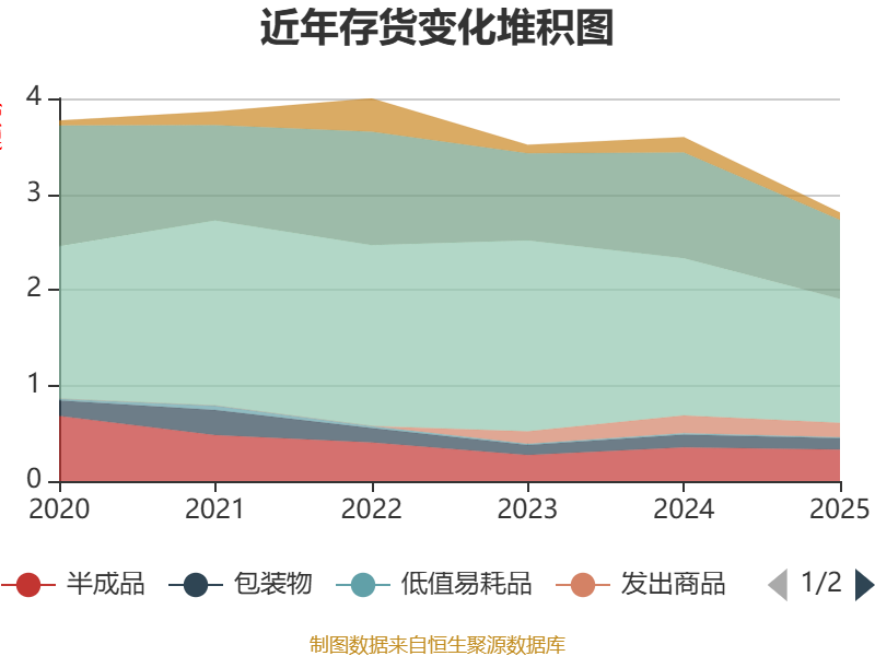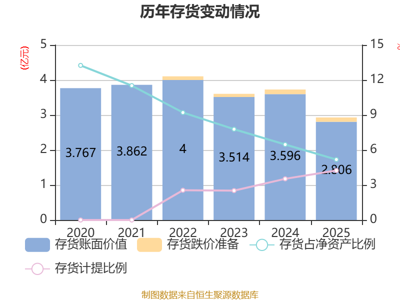 从存货变动来看,截至2025年末,公司存货账面价值为2.81亿元,占净资产的5.18%,较上年末减少7897.11万元。其中,存货跌价准备为1241.46万元,计提比例为4.24%。