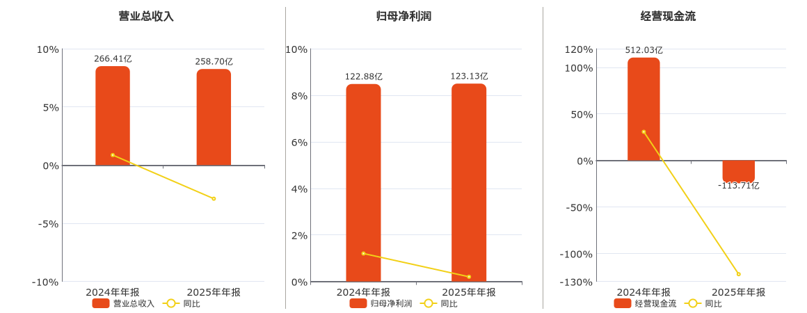 公司营业总收入为258.70亿元,在已披露的同业公司中排名第2。归母净利润为123.13亿元,在已披露的同业公司中排名第1,较去年同报告期归母净利润增加2466.90万元,实现5年连续上涨,同比较去年同期上涨0.20%。经营活动现金净流入为-113.71亿元。