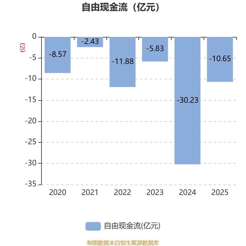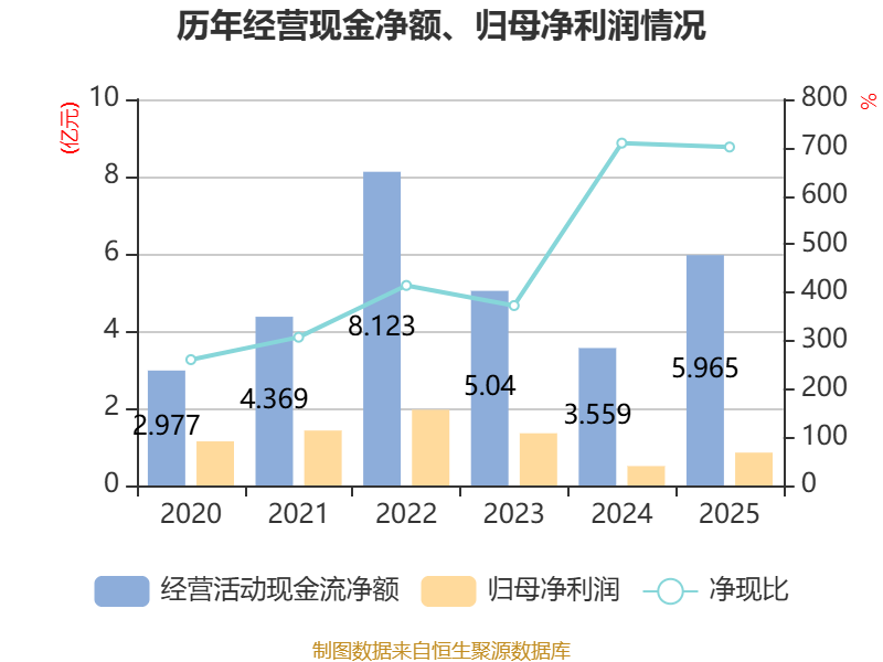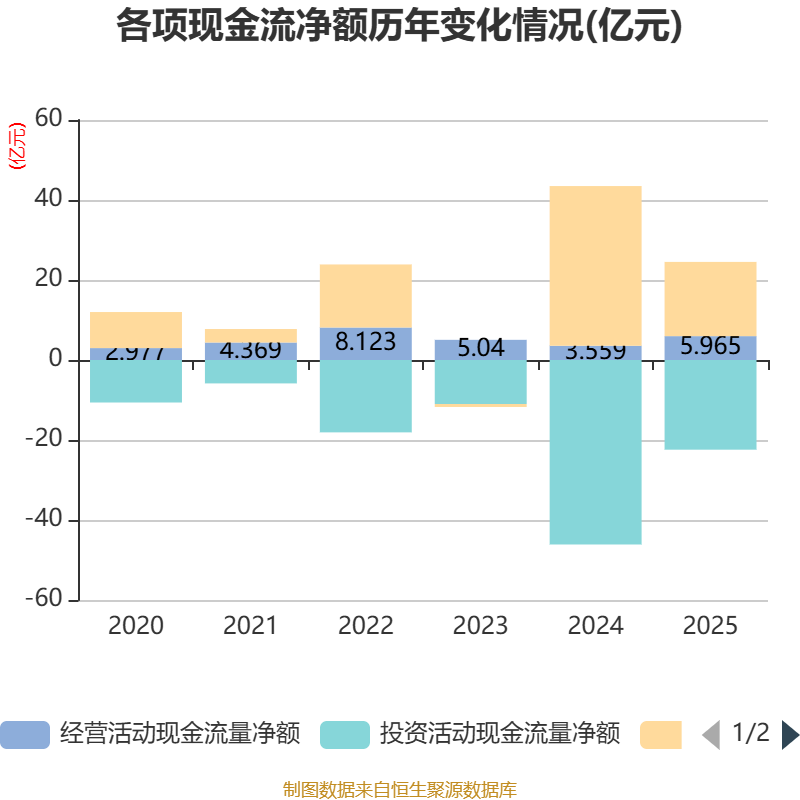 截至2025年,公司经营活动现金流净额为5.96亿元,同比增长67.59%;筹资活动现金流净额18.56亿元,同比减少21.37亿元;投资活动现金流净额-22.42亿元,上年同期为-46.12亿元。