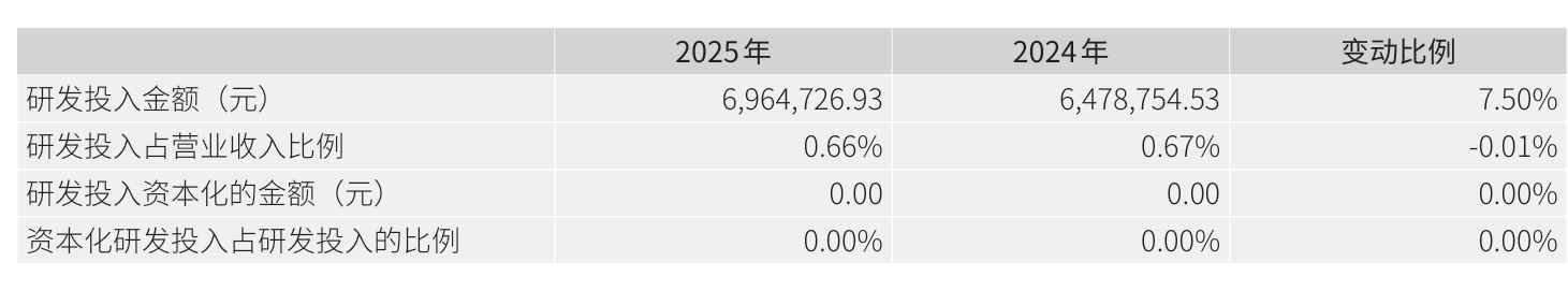 2025年全年,公司研发投入金额为696.47万元,同比增长7.5%;研发投入占营业收入比例为0.66%,相比上年同期下降0.01个百分点。此外,公司全年研发投入资本化率为0%。