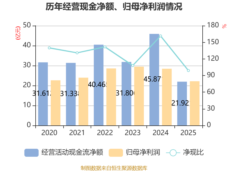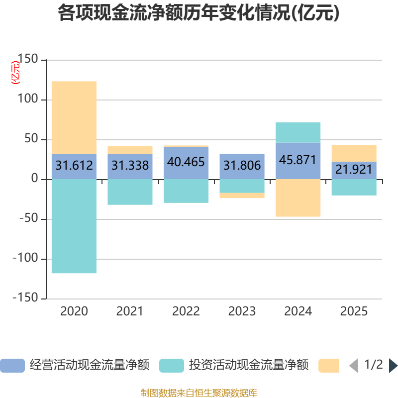 截至2025年,公司经营活动现金流净额为21.92亿元,同比下降52.21%;筹资活动现金流净额20.96亿元,同比增加68.15亿元;投资活动现金流净额-20.55亿元,上年同期为25.37亿元。