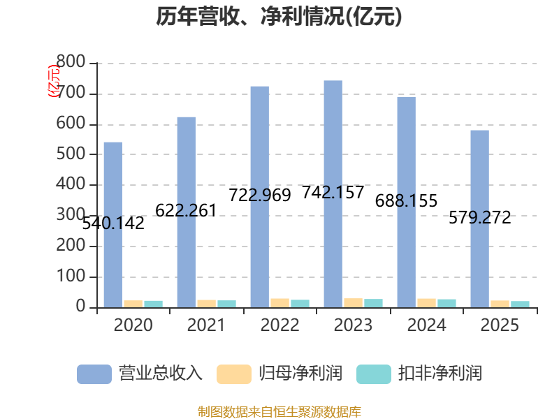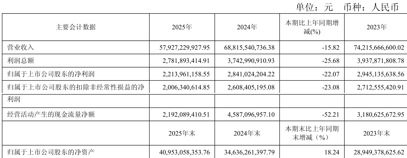 中证智能财讯隧道股份(600820)4月23日披露2025年年度报告。2025年,公司实现营业总收入579.27亿元,同比下降15.82%;归母净利润22.14亿元,同比下降22.07%;扣非净利润20.06亿元,同比下降23.08%;经营活动产生的现金流量净额为21.92亿元,同比下降52.21%;报告期内,隧道股份基本每股收益为0.66元,加权平均净资产收益率为6.60%。公司2025年度分配预案为:拟向全体股东每10股派现1.2元(含税)。