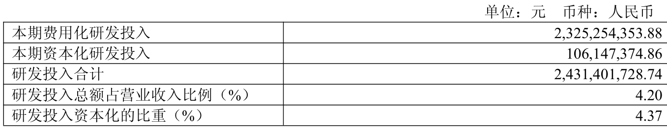2025年全年,公司研发投入金额为24.31亿元,同比下降9.62%;研发投入占营业收入比例为4.2%,相比上年同期上升0.29个百分点。此外,公司全年研发投入资本化率为4.37%。