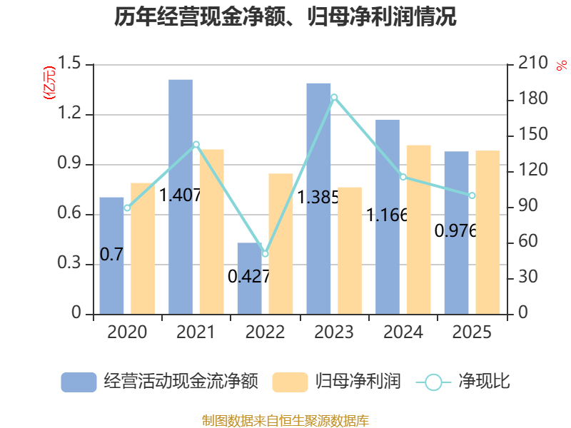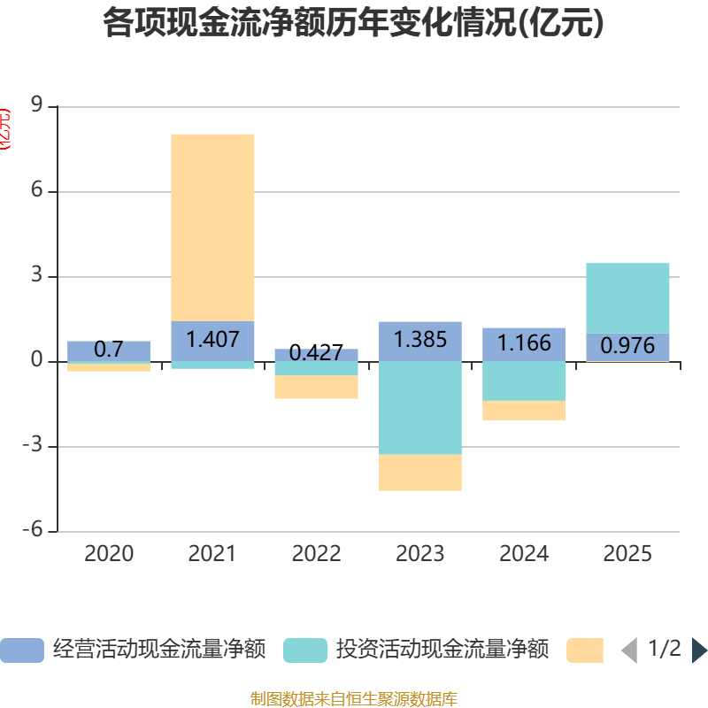 截至2025年,公司经营活动现金流净额为9761.52万元,同比下降16.28%;筹资活动现金流净额-391.06万元,同比增加6504.59万元;投资活动现金流净额2.48亿元,上年同期为-1.4亿元。