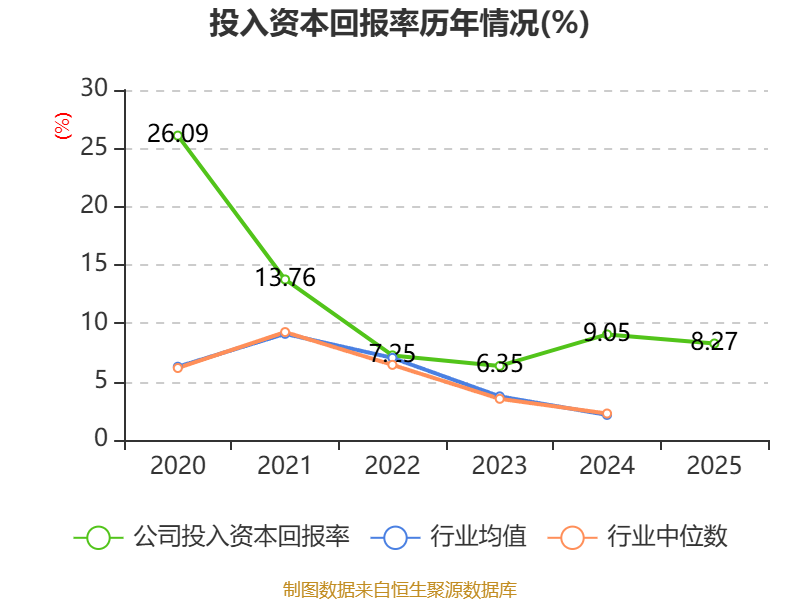 数据显示,2025年公司加权平均净资产收益率为8.48%,较上年同期下降0.81个百分点。公司2025年投入资本回报率为8.27%,较上年同期下降0.78个百分点。