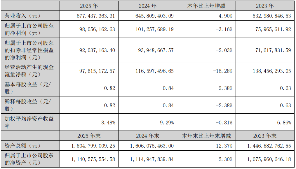 中证智能财讯华研精机(301138)4月23日披露2025年年度报告。2025年,公司实现营业总收入6.77亿元,同比增长4.90%;归母净利润9805.62万元,同比下降3.16%;扣非净利润9203.72万元,同比下降2.03%;经营活动产生的现金流量净额为9761.52万元,同比下降16.28%;报告期内,华研精机基本每股收益为0.82元,加权平均净资产收益率为8.48%。