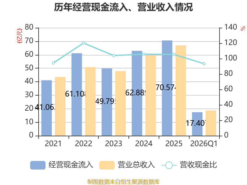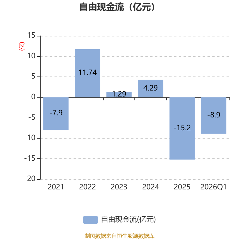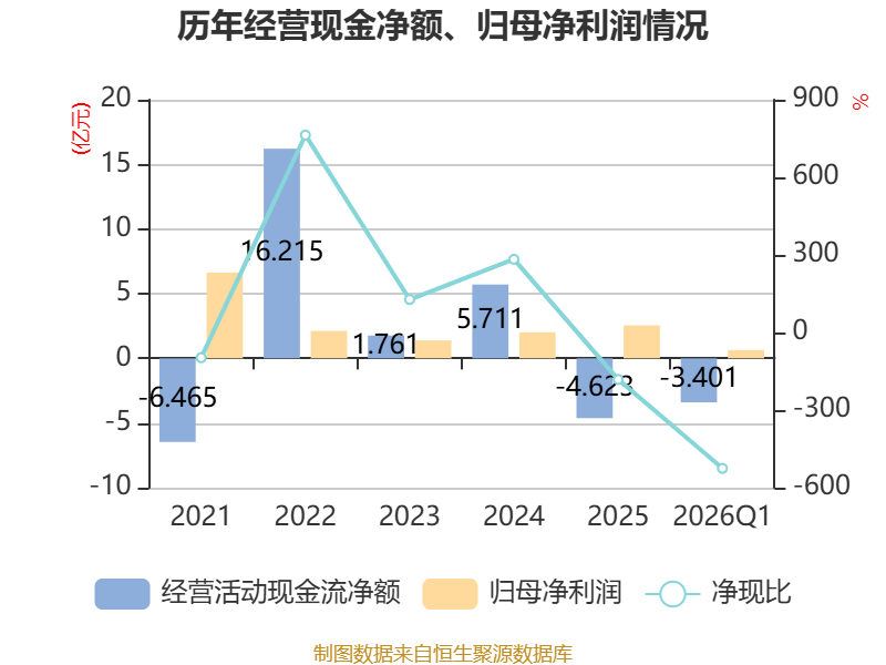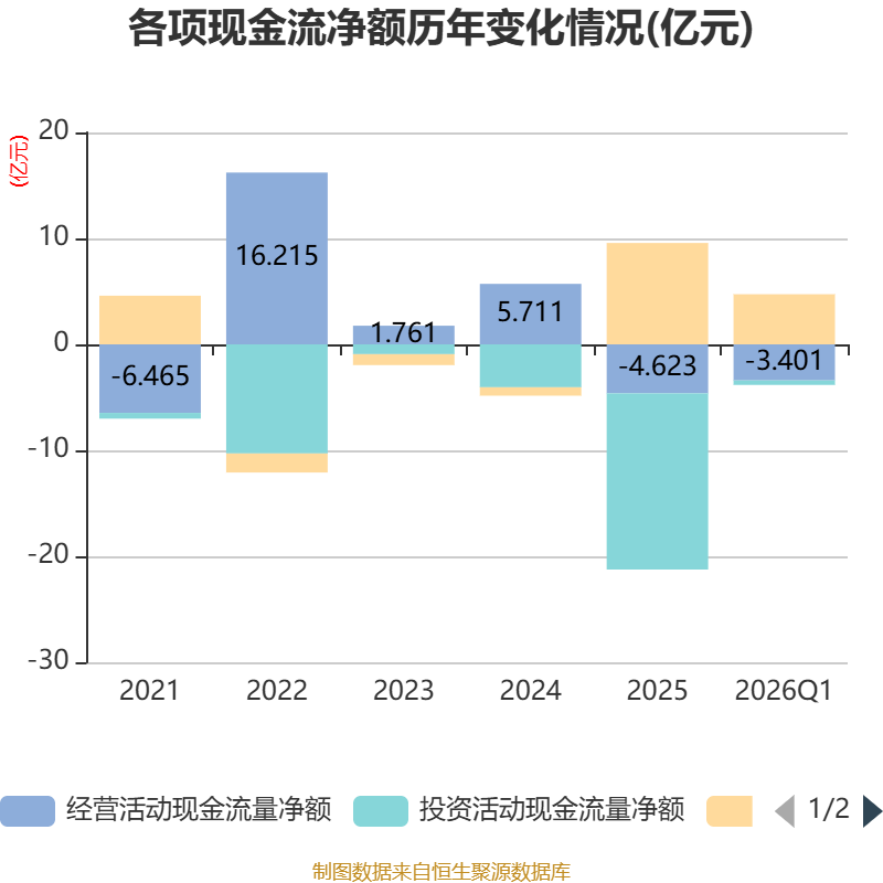 截至2026年一季度末,公司经营活动现金流净额为-3.4亿元,同比减少5.23亿元;筹资活动现金流净额4.73亿元,同比增加6.34亿元;投资活动现金流净额-4265.22万元,上年同期为-2.56亿元。