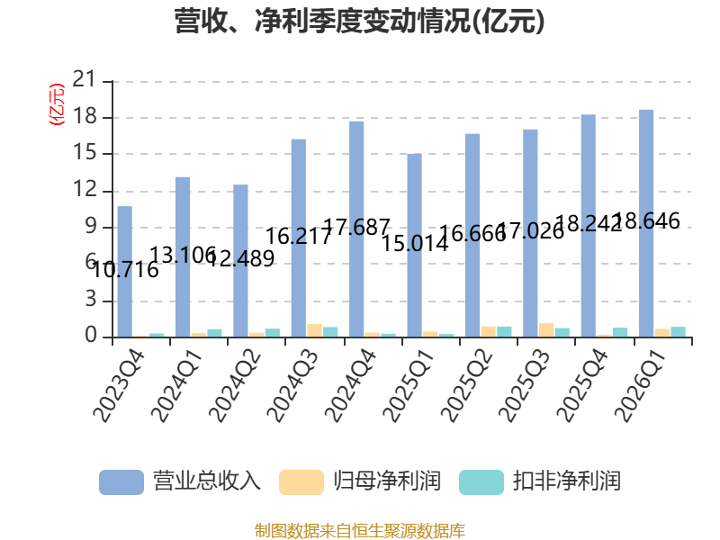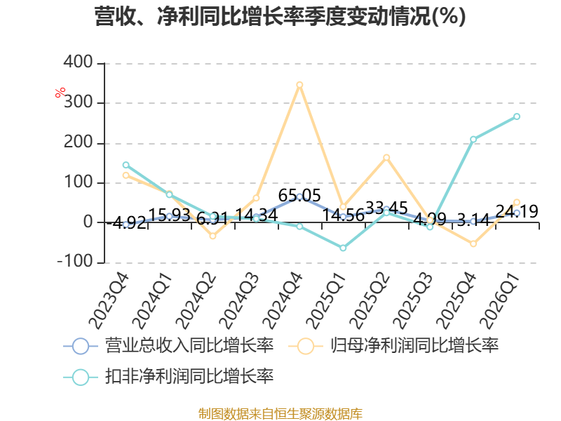 中证智能财讯寒锐钴业(300618)4月23日披露2026年第一季度报告。公司实现营业总收入18.65亿元,同比增长24.19%;归母净利润6474.65万元,同比增长51.07%;扣非净利润8140.54万元,同比增长266.17%;经营活动产生的现金流量净额为-3.4亿元,上年同期为1.83亿元;报告期内,寒锐钴业基本每股收益为0.21元,加权平均净资产收益率为1.18%。