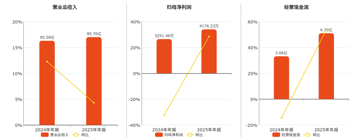 公司营业总收入为99.70亿元。归母净利润为4176.23万元,在已披露的同业公司中排名第32。经营活动现金净流入为4.70亿元。