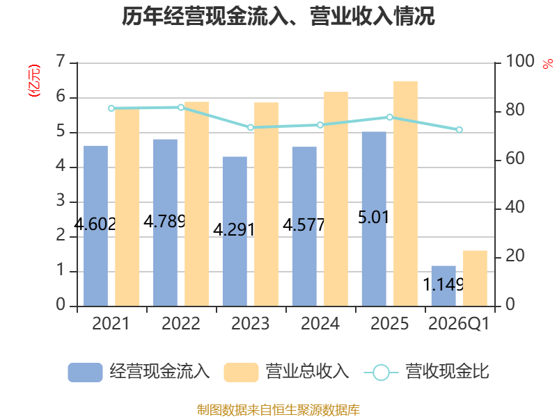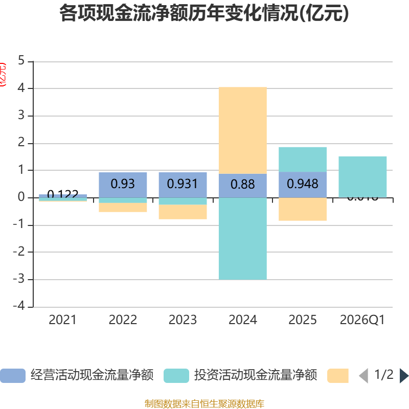 截至2026年一季度末,公司经营活动现金流净额为179.25万元,同比下降95.13%;筹资活动现金流净额-26.93万元,同比增加988.43万元;投资活动现金流净额1.5亿元,上年同期为-3319.05万元。