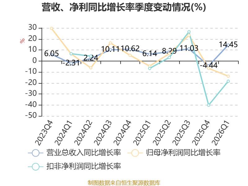 资产重大变化方面,截至2026年一季度末,公司交易性金融资产合计较上年末减少93.06%,占公司总资产比重下降13.37个百分点;货币资金较上年末增加46.55%,占公司总资产比重上升11.55个百分点;在建工程合计较上年末增加81.62%,占公司总资产比重上升1.36个百分点;存货较上年末增加10.04%,占公司总资产比重上升1.04个百分点。