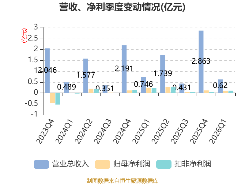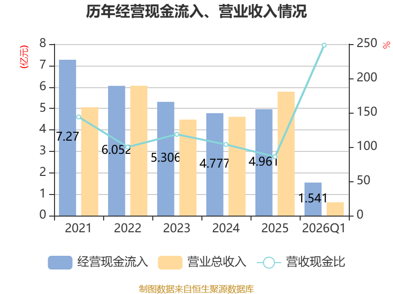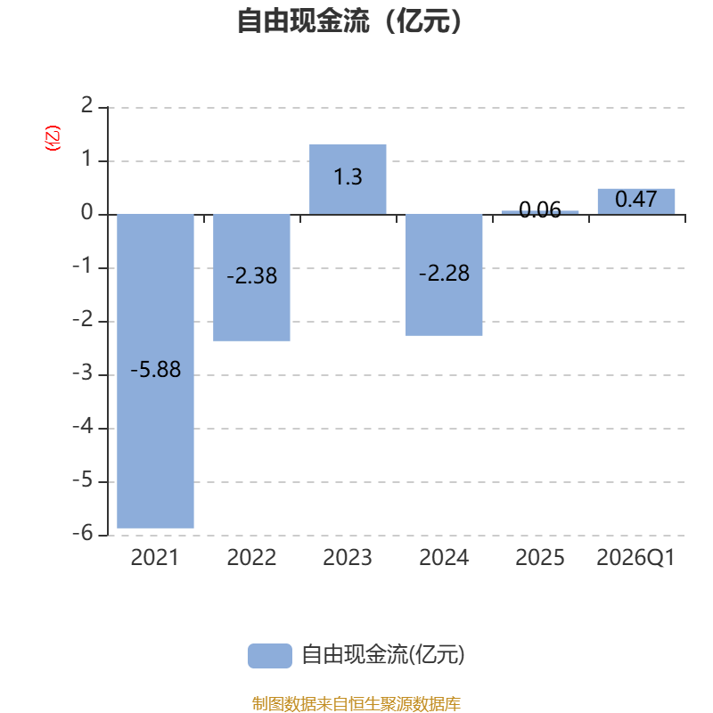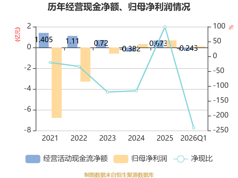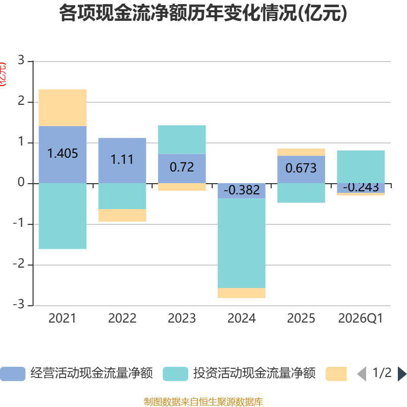 截至2026年一季度末,公司经营活动现金流净额为-2426.98万元,同比减少1913.11万元;筹资活动现金流净额-612.15万元,同比减少922.59万元;投资活动现金流净额8040万元,上年同期为4538.43万元。