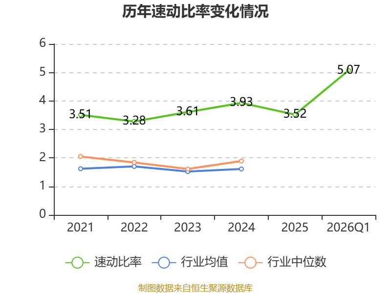 2026年第一季度,公司流动比率为5.34,速动比率为5.07。