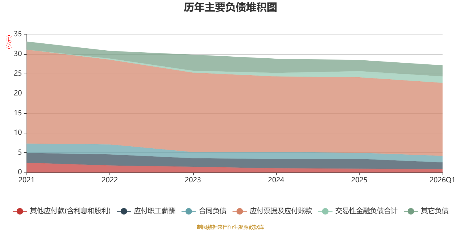 负债重大变化方面,截至2026年一季度末,公司应付职工薪酬较上年末减少33.3%,占公司总资产比重下降0.58个百分点;应付票据及应付账款较上年末减少3.26%,占公司总资产比重下降0.34个百分点;合同负债较上年末增加7.27%,占公司总资产比重上升0.09个百分点;交易性金融负债合计较上年末增加4.51%,占公司总资产比重上升0.06个百分点。