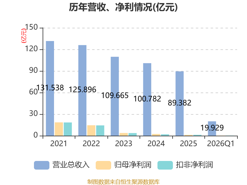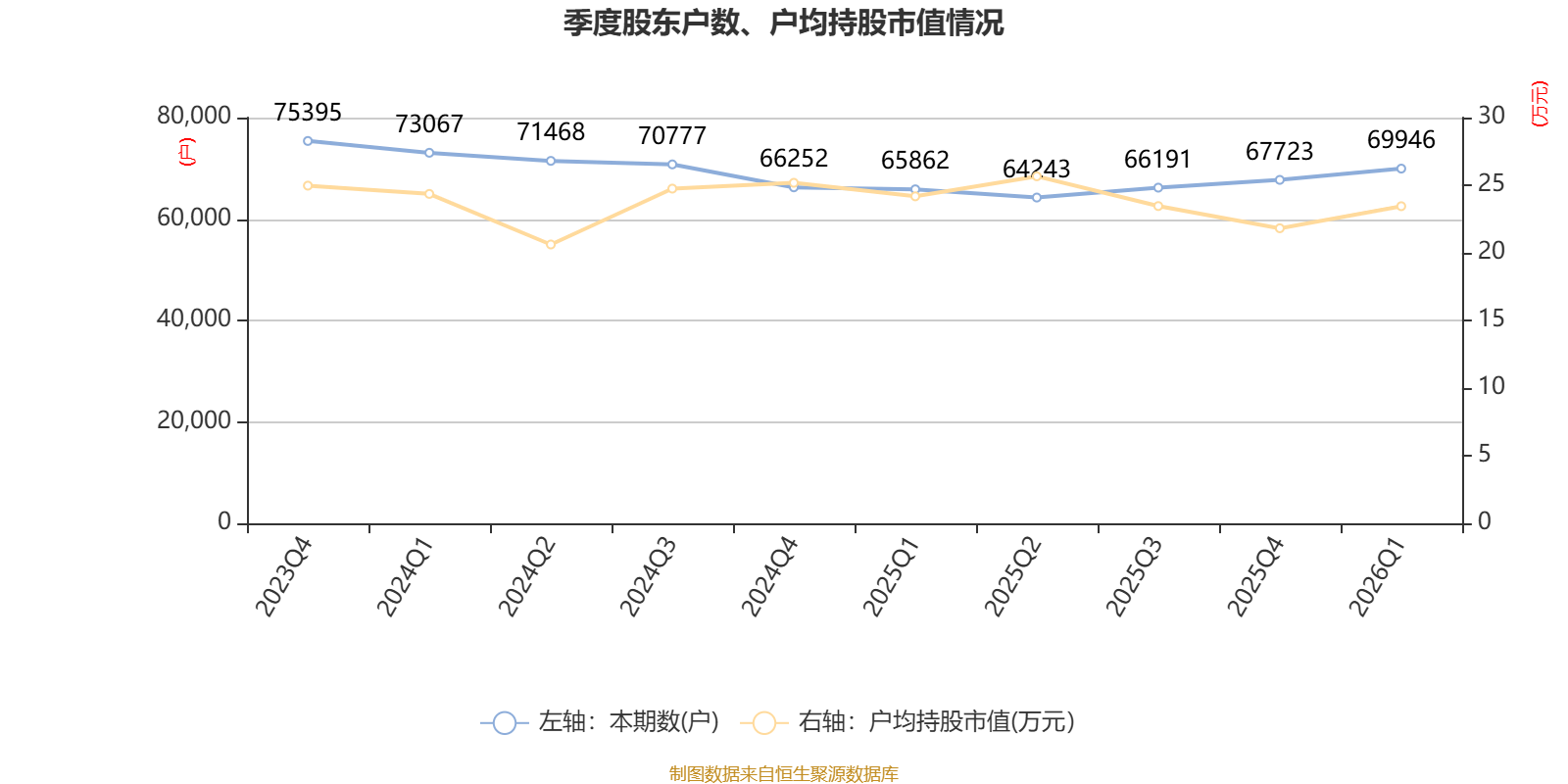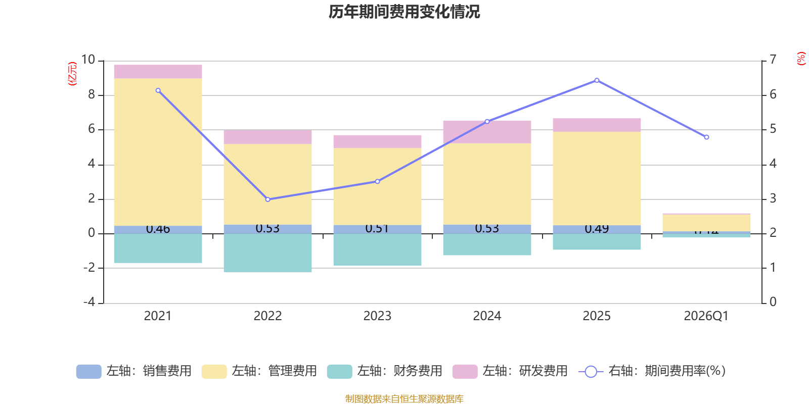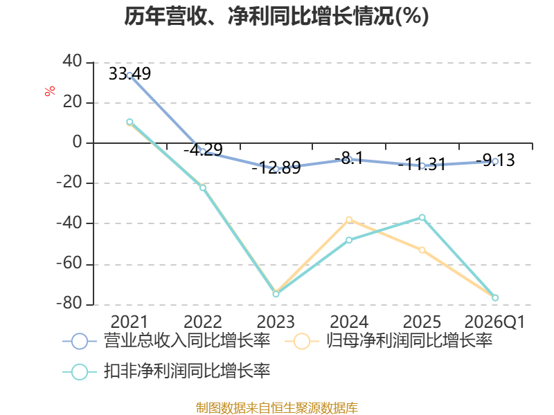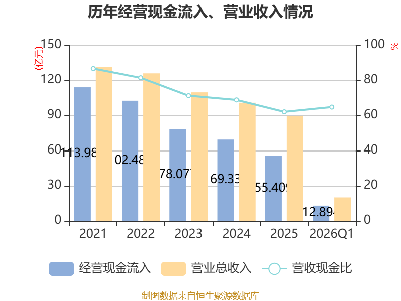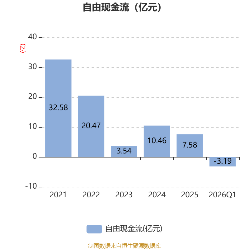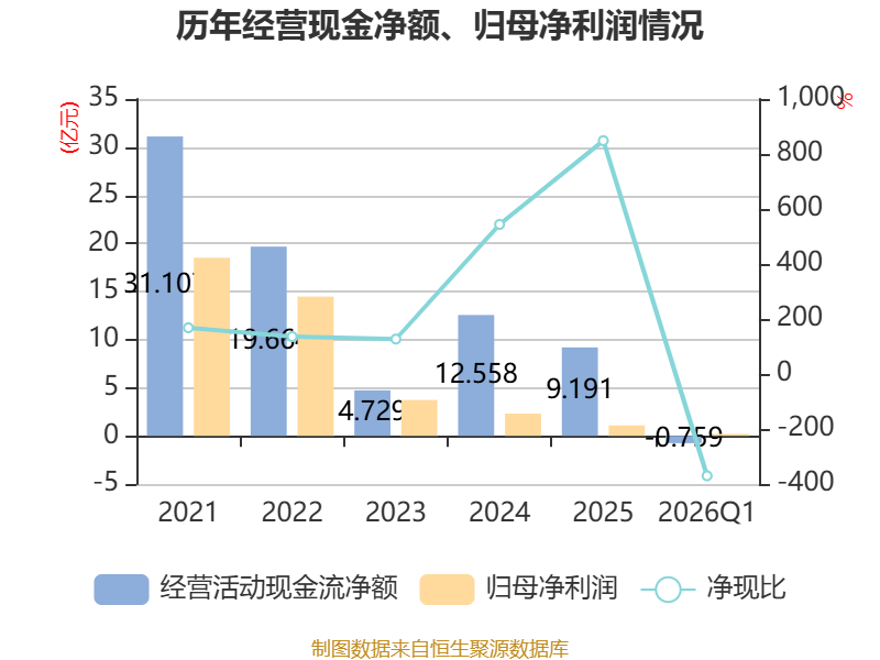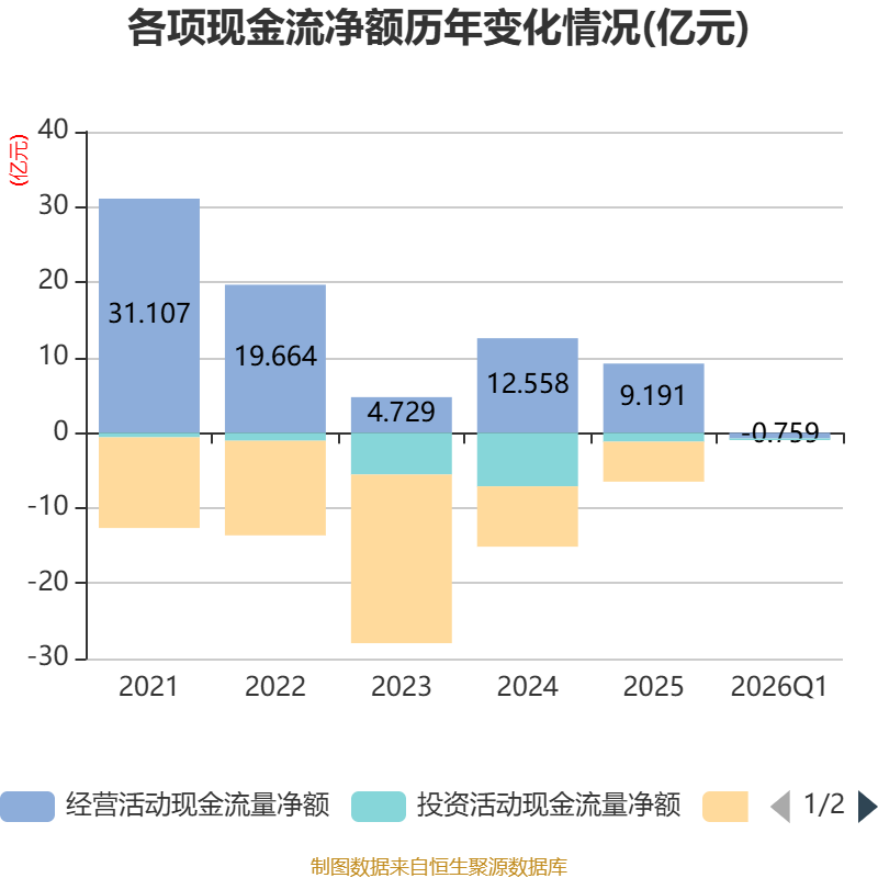 截至2026年一季度末,公司经营活动现金流净额为-7585.87万元,同比增加3.56亿元;筹资活动现金流净额-35.68万元,同比增加4298.97万元;投资活动现金流净额-2212.86万元,上年同期为-4807.71万元。