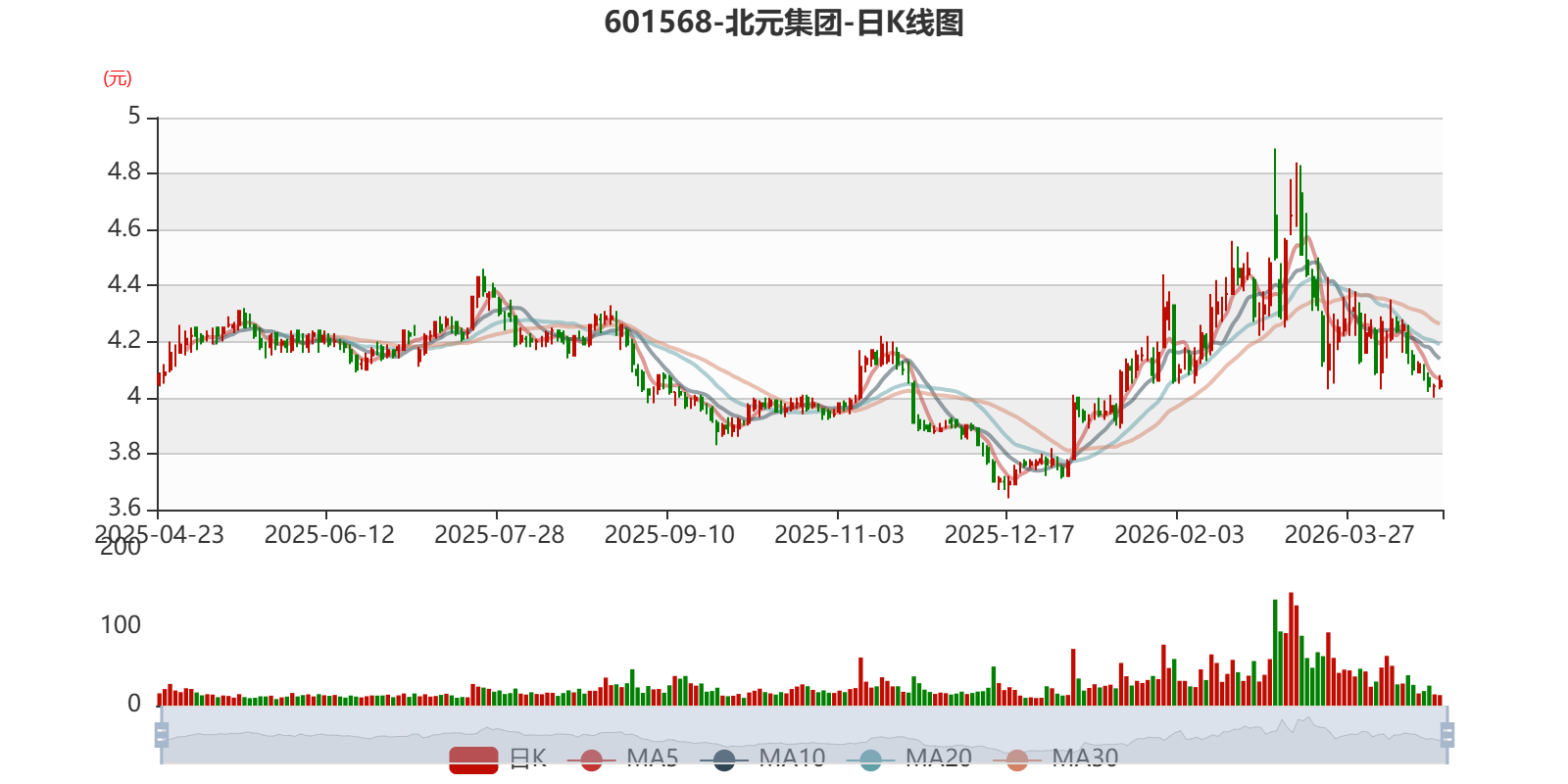 中证智能财讯北元集团(601568)4月23日披露2026年第一季度报告。公司实现营业总收入19.93亿元,同比下降9.13%;归母净利润2048.46万元,同比下降76.67%;扣非净利润2162.97万元,同比下降76.77%;经营活动产生的现金流量净额为-7585.87万元,上年同期为-4.32亿元;报告期内,北元集团基本每股收益为0.005元,加权平均净资产收益率为0.18%。