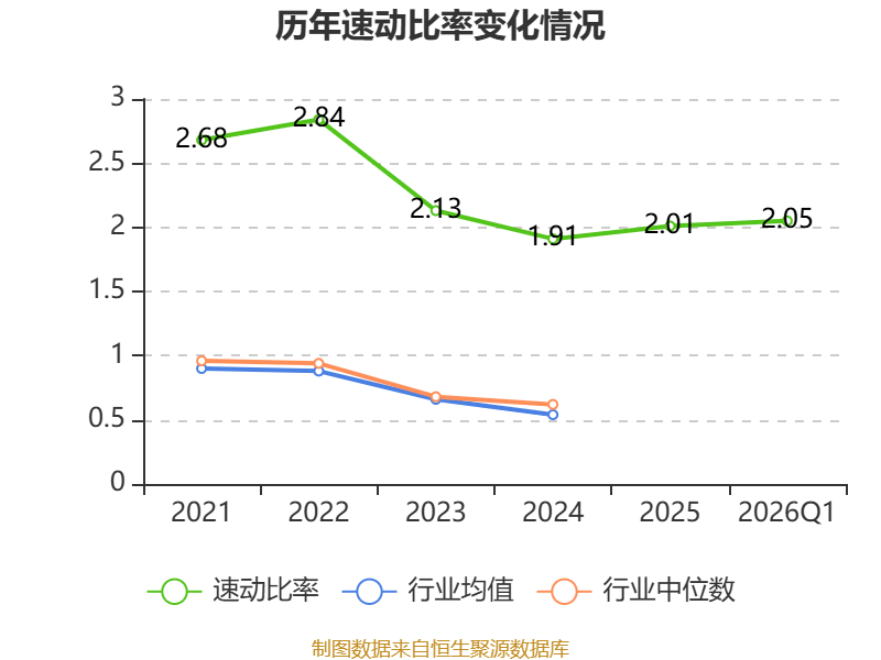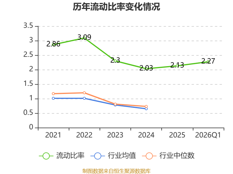 2026年第一季度,公司流动比率为2.27,速动比率为2.05。