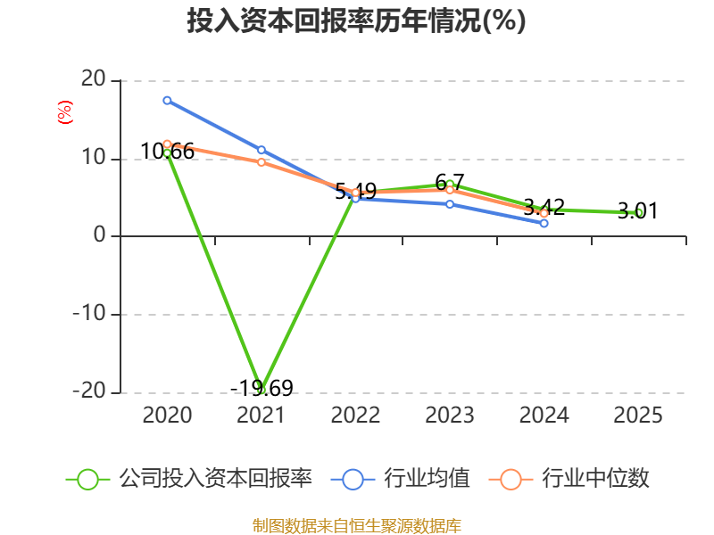 数据显示,2025年公司加权平均净资产收益率为3.32%,较上年同期下降0.19个百分点。公司2025年投入资本回报率为3.01%,较上年同期下降0.41个百分点。