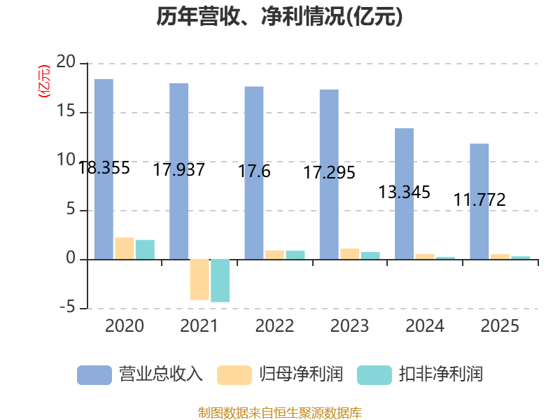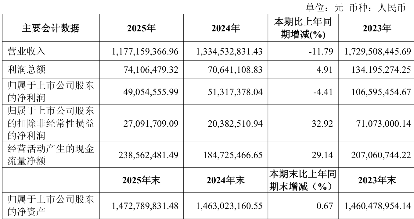 中证智能财讯中衡设计(603017)4月23日披露2025年年度报告。2025年,公司实现营业总收入11.77亿元,同比下降11.79%;归母净利润4905.46万元,同比下降4.41%;扣非净利润2709.17万元,同比增长32.92%;经营活动产生的现金流量净额为2.39亿元,同比增长29.14%;报告期内,中衡设计基本每股收益为0.18元,加权平均净资产收益率为3.32%。公司2025年度分配预案为:拟向全体股东每10股派现1.5元(含税)。