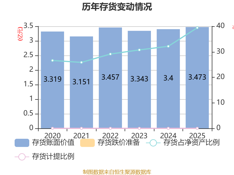 从存货变动来看,截至2025年末,公司存货账面价值为3.47亿元,占净资产的39.41%,较上年末增加724.73万元。公司本期没有计提存货跌价准备。