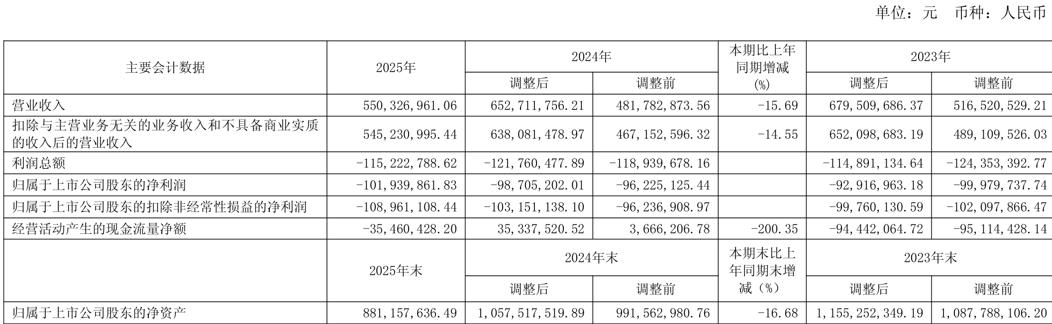中证智能财讯空港股份(600463)4月23日披露2025年年度报告。2025年,公司实现营业总收入5.5亿元,同比下降15.69%;归母净利润亏损1.02亿元,上年同期亏损9870.52万元;扣非净利润亏损1.09亿元,上年同期亏损1.03亿元;经营活动产生的现金流量净额为-3546.04万元,上年同期为3533.75万元;报告期内,空港股份基本每股收益为-0.3398元,加权平均净资产收益率为-10.94%。