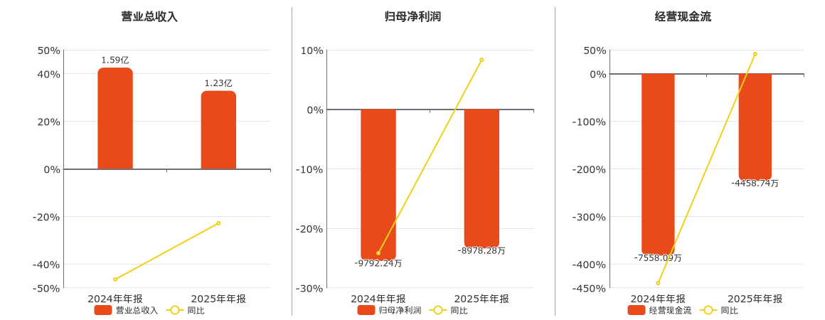公司营业总收入为1.23亿元,在已披露的同业公司中排名第12,较去年同报告期营业总收入减少3639.34万元,同比较去年同期下降22.86%。归母净利润为-8978.28万元,在已披露的同业公司中排名第11。经营活动现金净流入为-4458.74万元,在已披露的同业公司中排名第11。